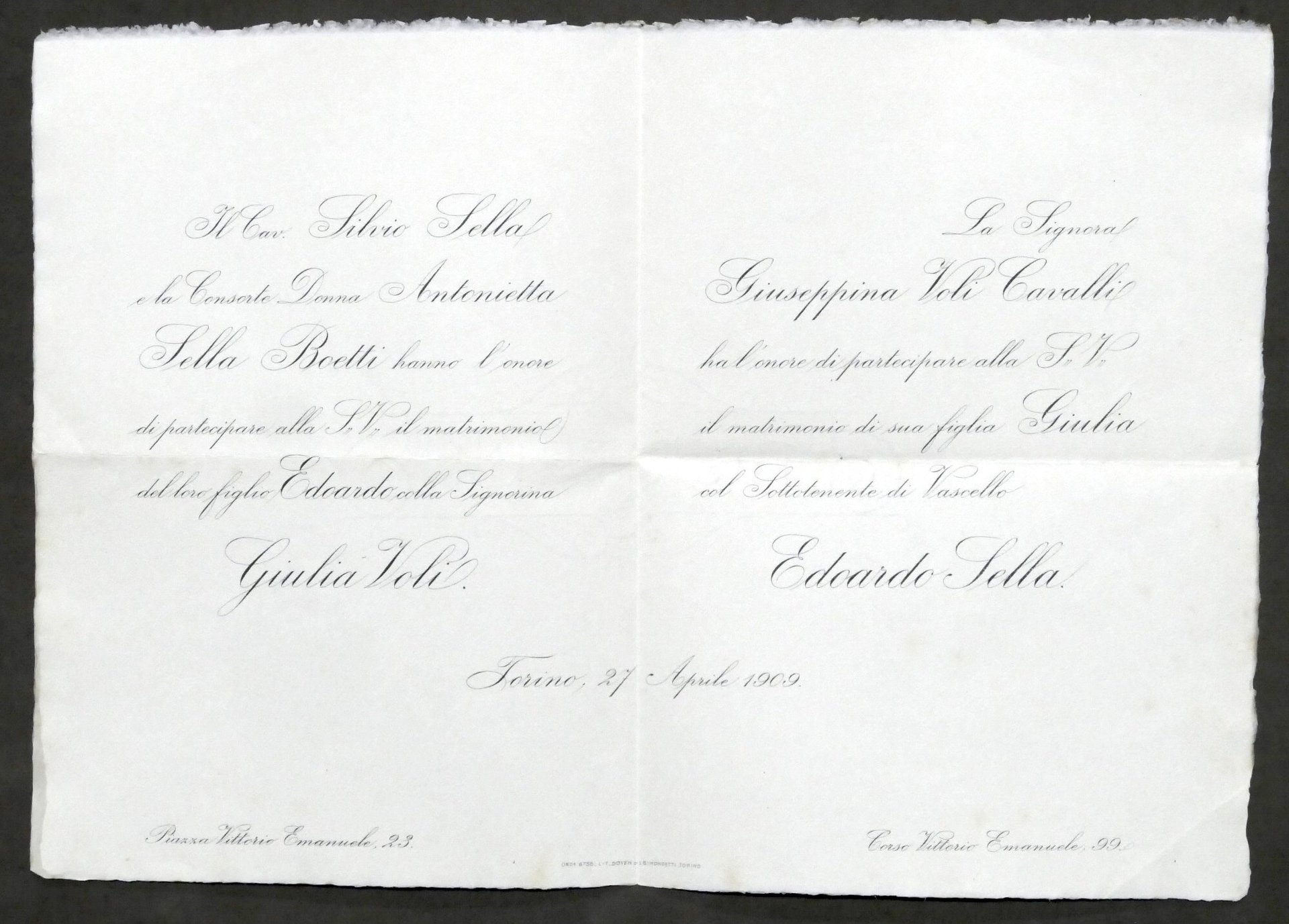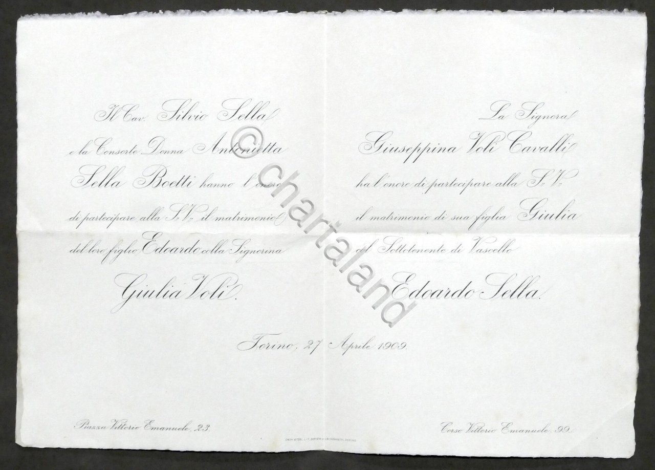 Invito Nozze sottottenente Edoardo Sella con la signorina Giulia Voli - 1909