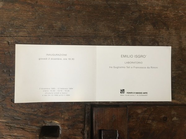 Invito pieghevole cm. 11 X 30 Dell'esposizione Laboratorio tra Guglielmo Tell e Francesca da Rimini alla Galleria Fonte d'Abisso in Milano dal 2 dicembre 1993 al 12 febbraio 1994