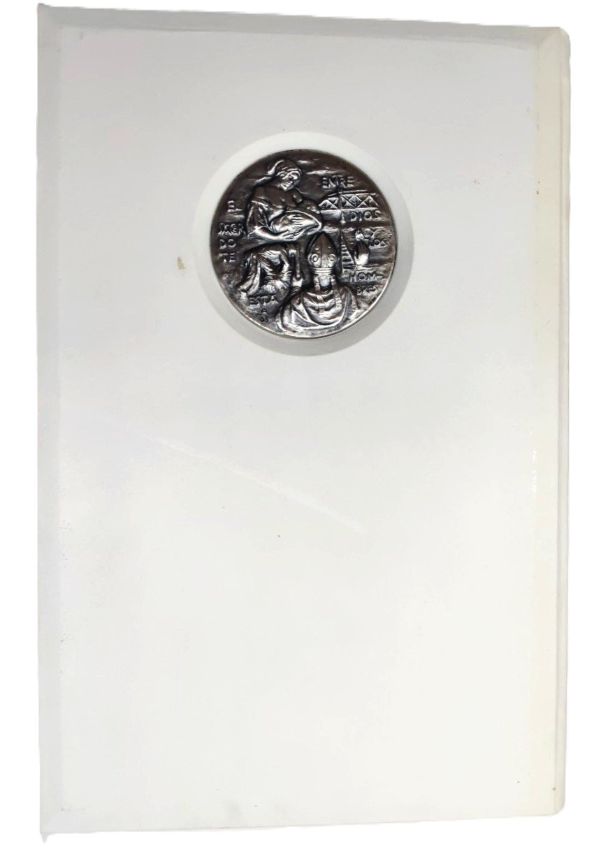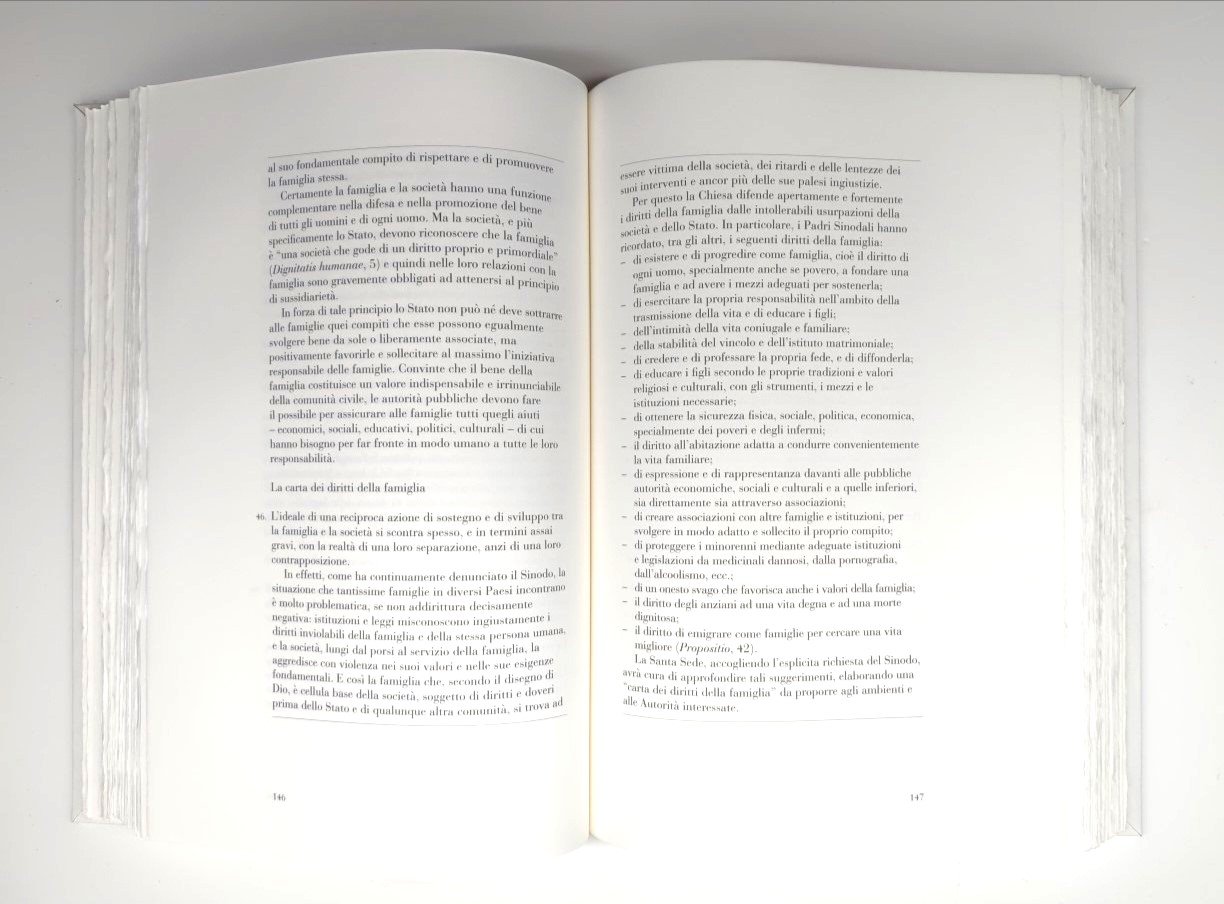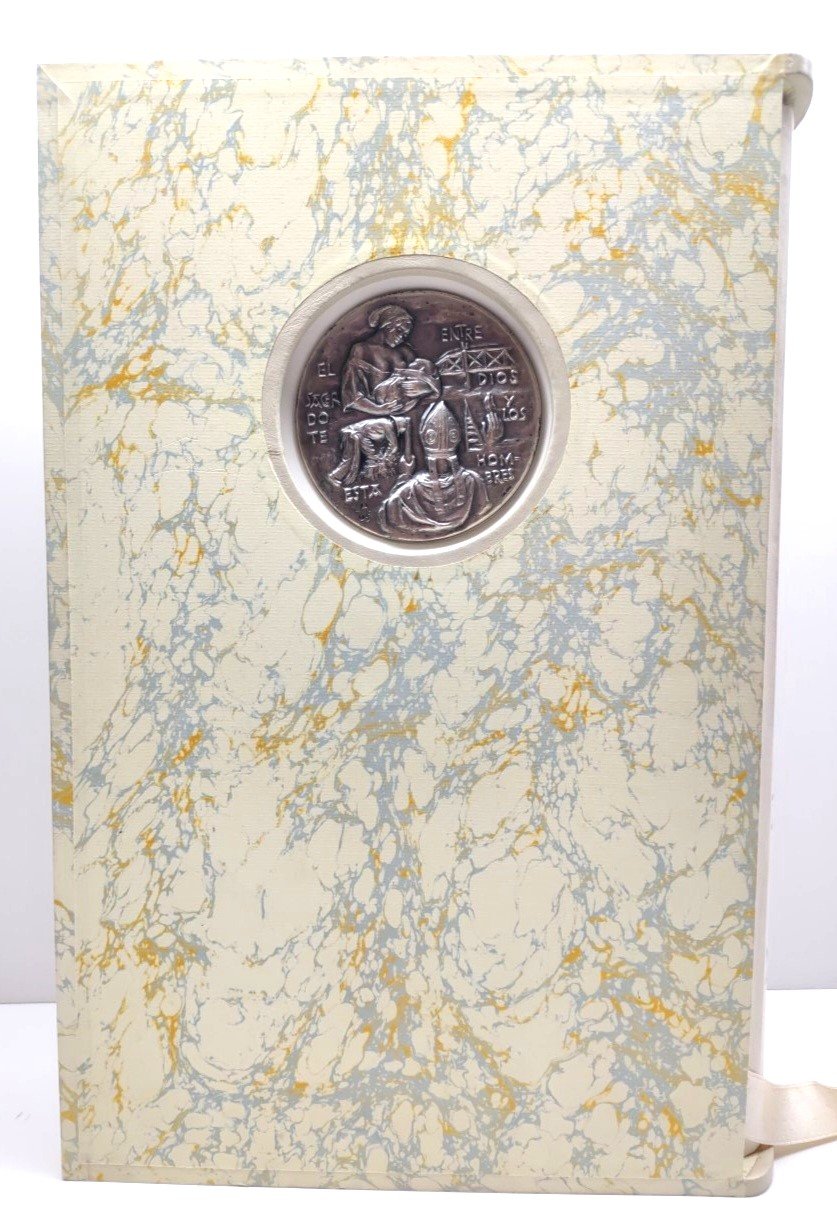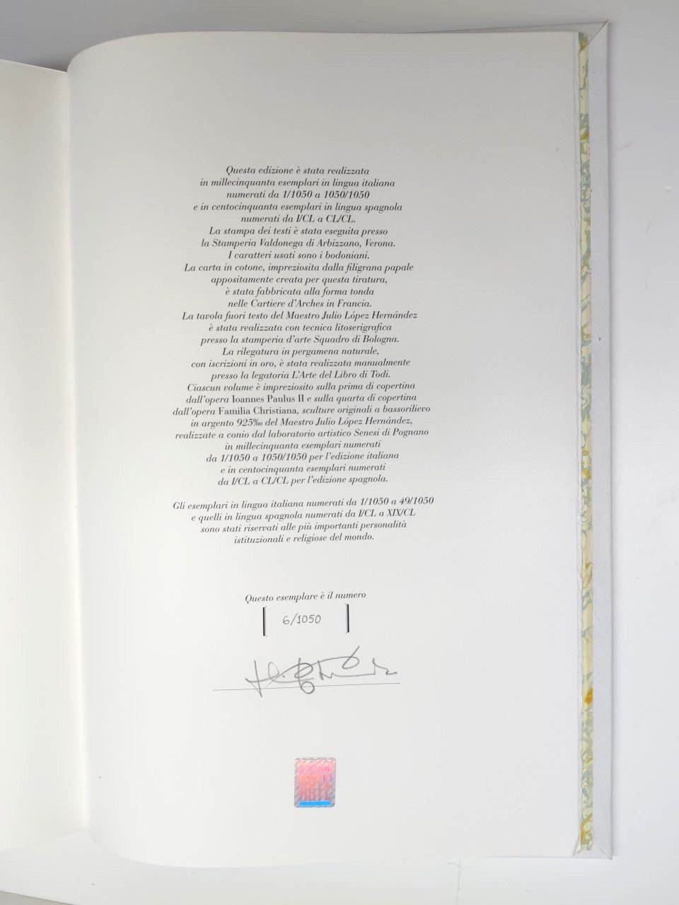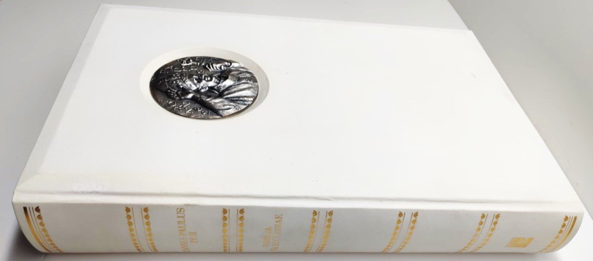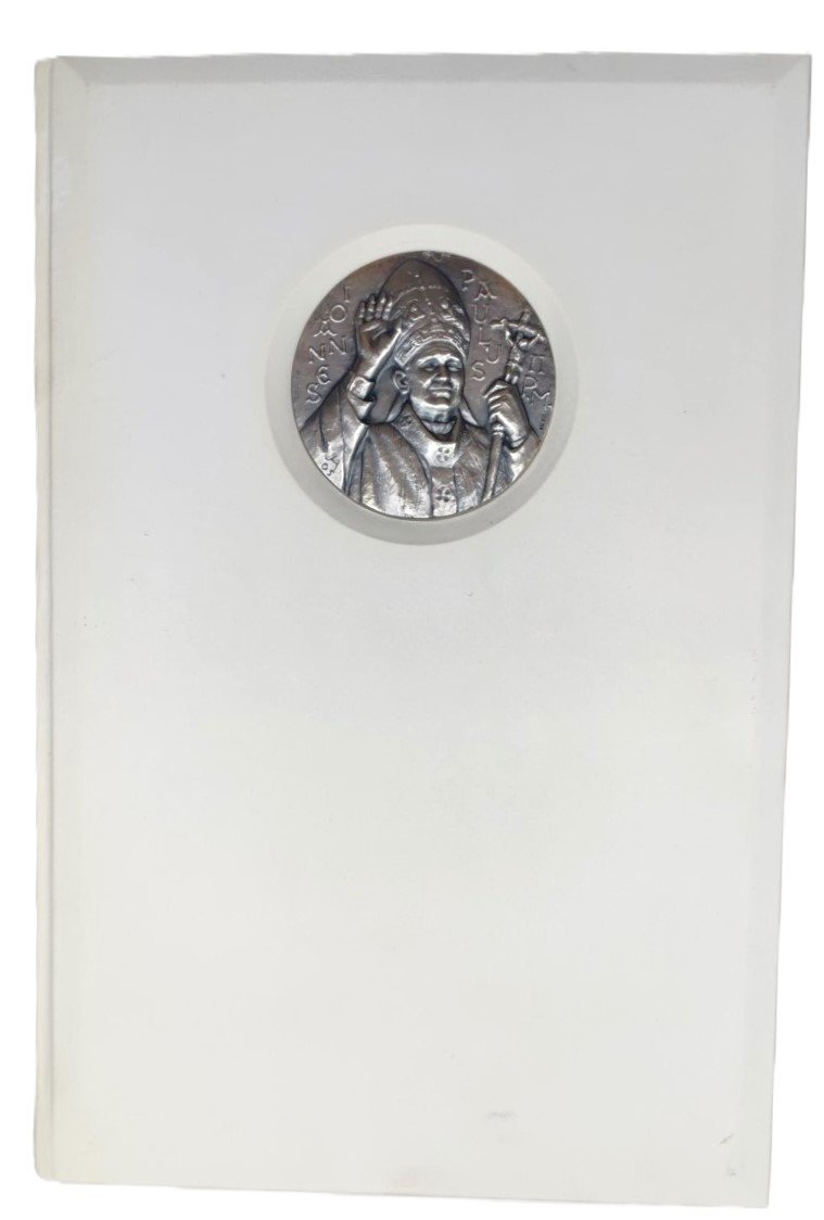 La rilegatura in pergamena naturale con iscrizione in oro; sulla prima di copertina dall'opera Johannes Paulus II e sulla quarta di copertina dall'opera famiglia Christiana sculture originali a bassorilievi in argento 925 del maestro Julio Lopez Hernandez