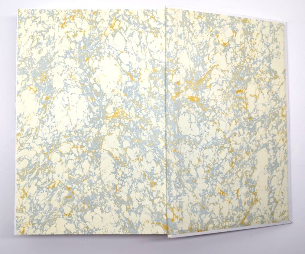 cofanetto rigido in legno rivestito in carta marmorizzata in buono stato, legatura rigida in pelle bianca con lievi segni di usura alcune lievissime sporcizie, dorso con titolo e fregi in oro leggermente ingiallito dal sole, interno in buono stato, dimensioni cm 46 per 31,5 x 9