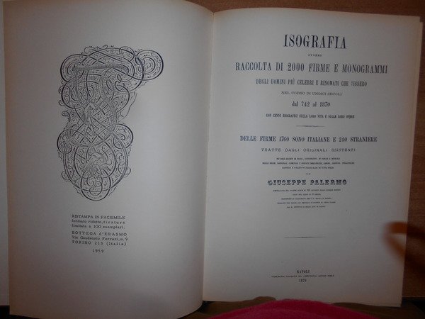 GIUSEPPE, PALERMO. Torino, Bottega D' Erasmo, 1959. ISOGRAFIA ovvero Raccolta di 2000 Firme e Monogrammi degli uomini più celebri e rinomati che vissero nel corso di undici secoli dal 742 al 1870. Con cenni biografici sulla loro vita e sulle loro opere. Delle firme 1760 sono italiane e 240 straniere tratte dagli originali esistenti. Ristampa in fac-simile formato ridotto, tiratura limitata a 100 esemplari. In-4°, m. tela con angoli, titolo in oro entro tassello al dorso. PP. 76+36 TAVOLE+VIII INDICI. Ottimo esemplare. Uff. E - I - 7 - 2