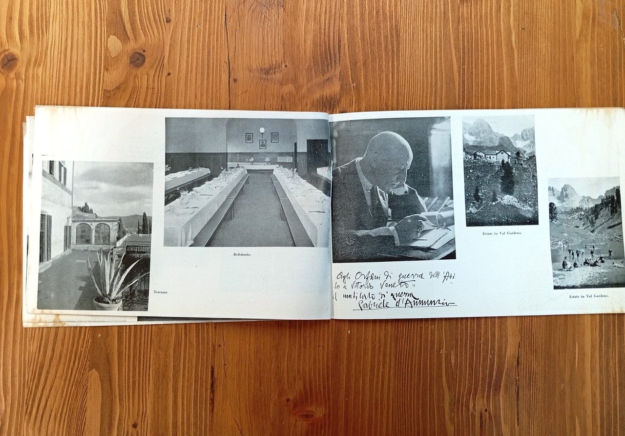 Opuscolo in formato album (16,5 x 24,5 cm) atto a illustrare la struttura, le attività e il paesaggio dell'Istituto per orfani di guerra di Firenze, situato presso Villa Rusciano dal 1919 al 1979 circa. La pubblicazione è approssimativamente databile al secondo quarto del Novecento - Brossura editoriale rilegata a punto metallico, 12 pagine non numerate; a un breve testo di presentazione seguono numerose fotografie in bianco e nero della Villa, dalle facciate esterne alle aule; riprodotto anche un autografo di Gabriele D'Annunzio dedicato agli stessi orfani di guerra. Gore ai margini della copertina e delle carte; esemplare in condizioni accettabili, comunque integro, di un documento non comune.