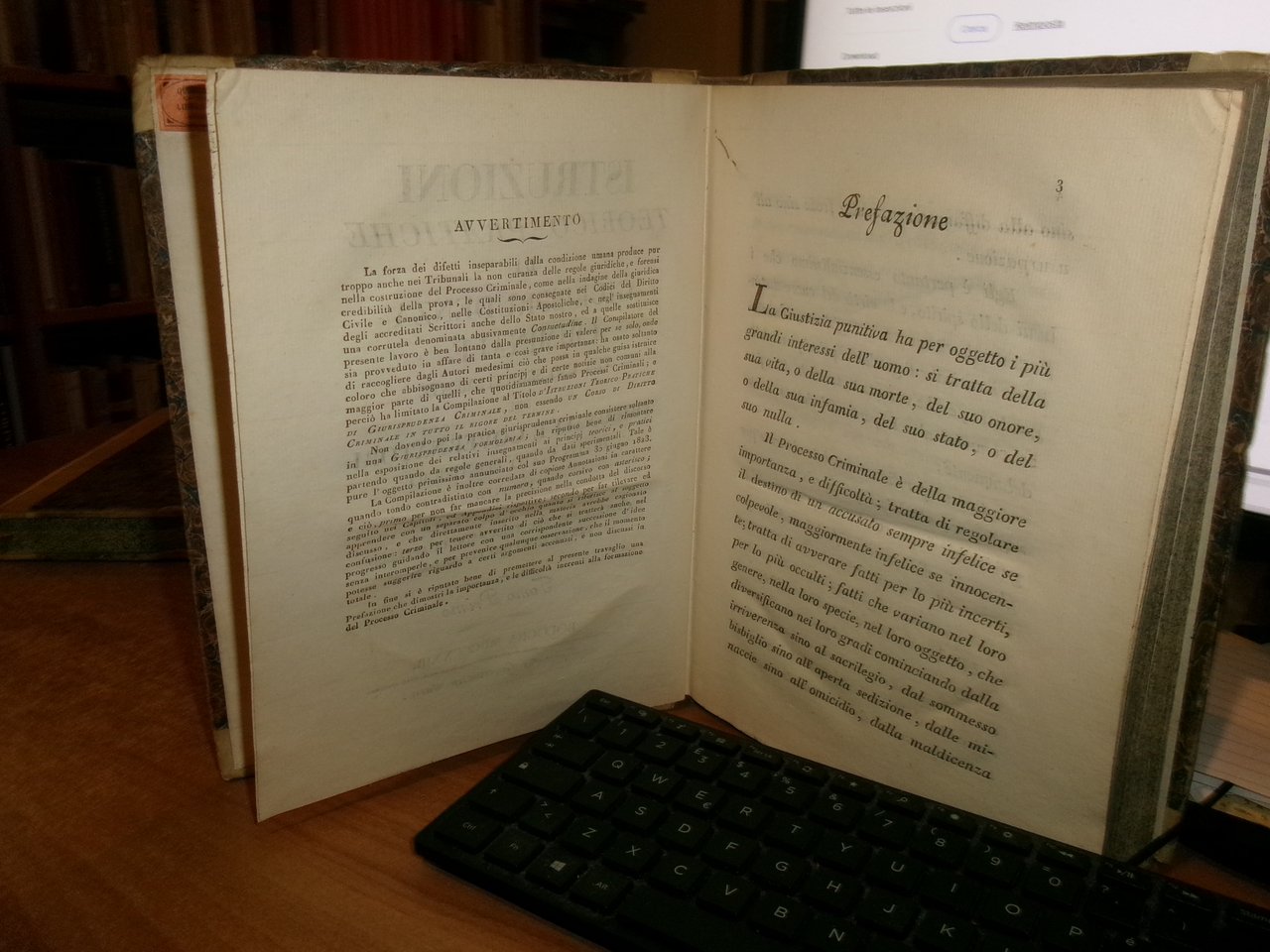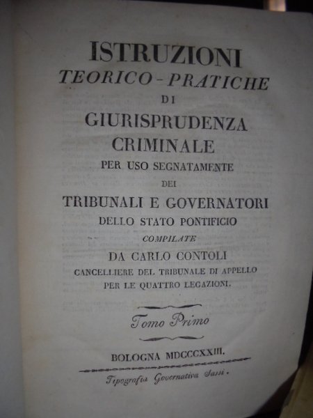 Contoli, Carlo. Bologna, tip. Sassi, 1823 - 1824. Istruzioni teorico - pratiche di giurisprudenza criminale per uso segnatamente dei tribunali e governatori dello Stato Pontificio. 2 volumi in - 8° grande, m. pergamena. 462, (14) pp.; 403, (1) pp. Ben conservati. Segno di antico tarlo nel margine bianco nelle prime 27 pp. del vol. 1. Uff. stanzetta scat. 1 Tin.