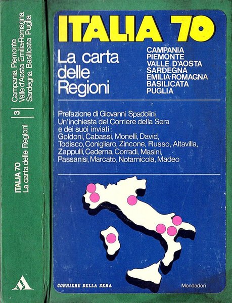 Opera incompleta volume uno di tre, rilegato in cartoncino plastificato con copertina applicata illustrata. Prefazione di Giovanni Spadolini. Il volume si occupa delle seguenti regioni: Campania, Piemonte, Valle D' Aosta, Sardegna, Emilia Romagna, Basilicata, Puglia. All' interno un' inchiesta degli inviati del Corriere della Sera tra cui Goldoni, Cederna, Todisco. Ricco di immagini e statistiche inerenti alle regioni trattate. Buono lo stato di conservazione con pagine color seppia come i tagli. Numero pagine 527.