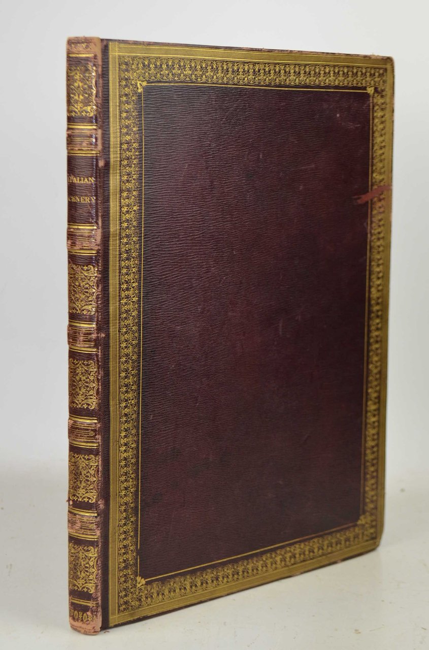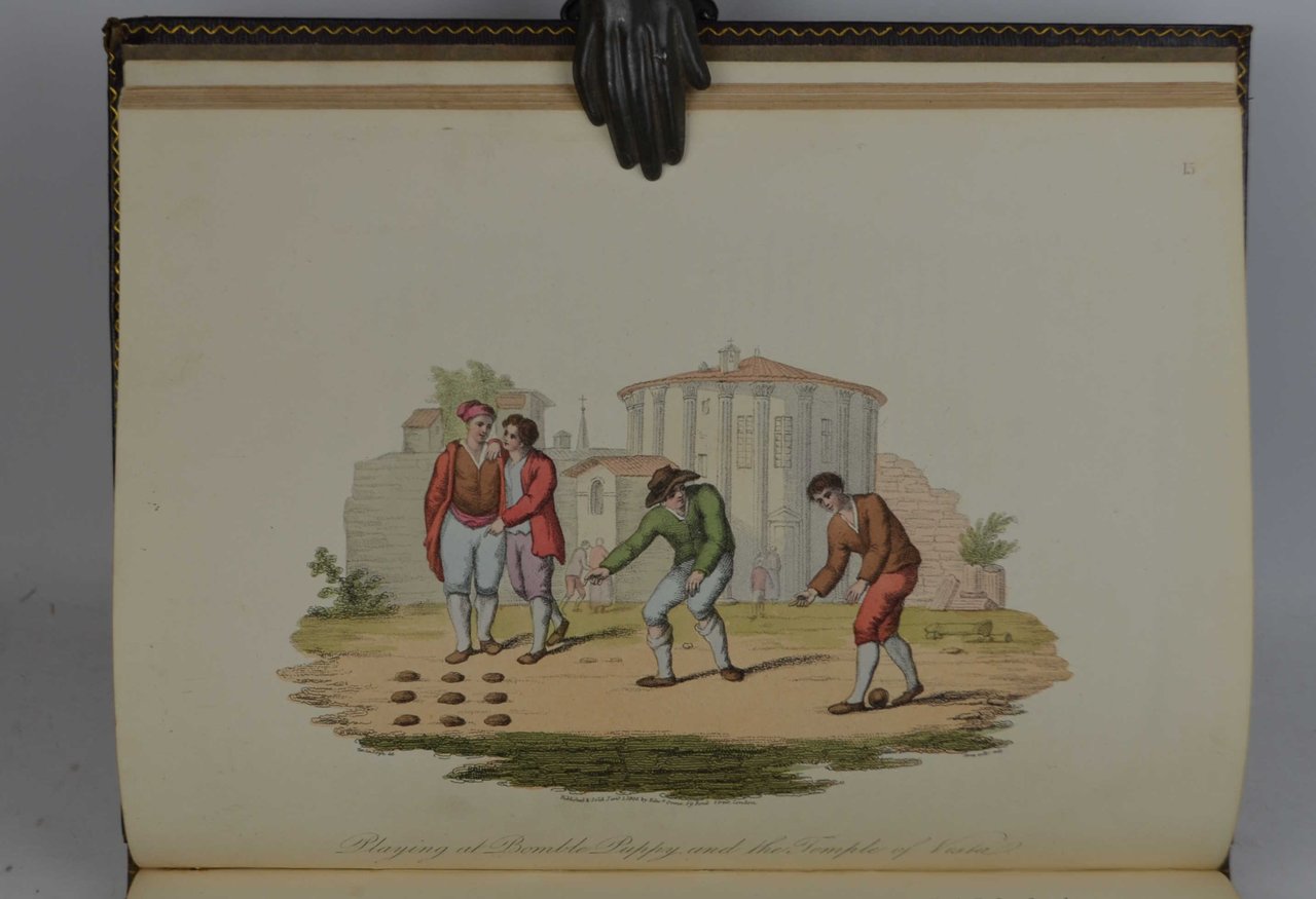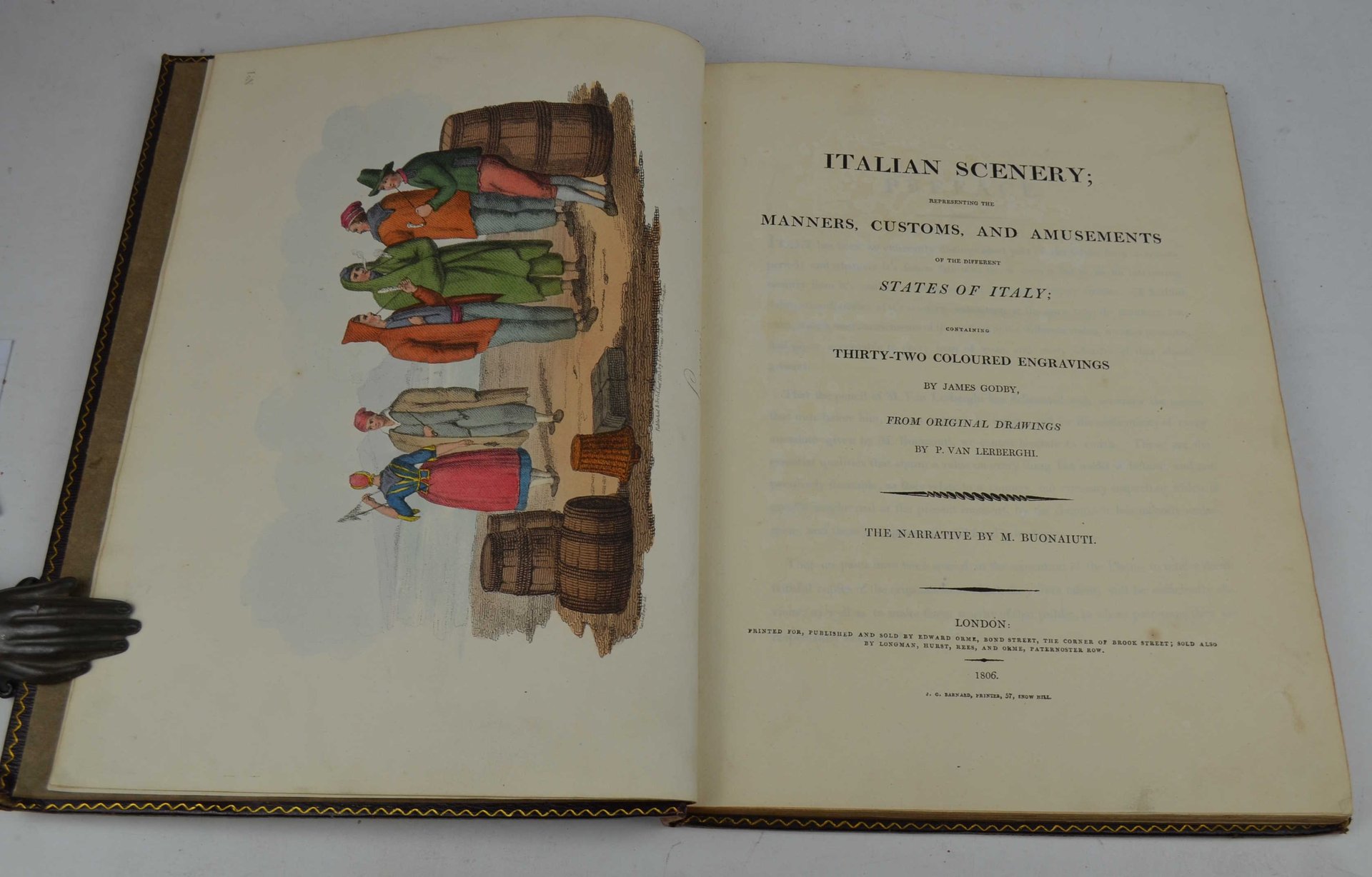Cm. 35, pp. (4) 74 (2). Con 32 tavole fuori testo incise in rame ed in fine coloritura coeva di costumi e rappresentazioni popolari ed una tavola con musica della tarantella. Bella legatura coeva in pieno marocchino marron, dorso a piccoli nervi con titoli e ricchi fregi in oro. Piatti inquadrati da cornici dorate. Dentelles interne e tagli dorati. Ex libris. Esemplare fresco e genuino in eccellente stato di conservazione, in prima tiratura. Ciascuna tavola d'illustrazioni è accompagnata da un testo esplicativo in francese ed inglese. I soggetti rappresentati appartengono alla cultura popolare italiana principalmente di Roma, Napoli e del Piemonte. Il testo è opera di Buonaiuti, mentre le tavole sono incise da James Godby dai disegni originali di P. van Lerberghi. Edizione originale, non comune e celebrata dalle maggiori bibliografie (Colas, Lipperheide e Pitrè). Choix (10995): "superbes gravures... ouvrage rare. On y remarque e. a. 4 planches qui ont trait à la musique: Dance of Lazzaroni children, Dance of the Tarantella, the Street Singers, a Piedmontese Dance"; Fiammetta Olschki: "Opera importante per la storia del costume locale e popolare"; Brunet (II, 1639): "Ouvrage assez bien execute, tant dans les gravures que dans le texte".