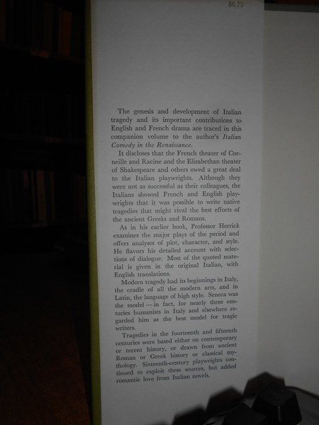 MARVIN T. HERRICK. The University of Illinois Press, Urbana, 1965. Italian Tragedy in the Renaissance. In-8°, cartonato edit. con sovracopertina. vi, 315 pp. Come nuovo. Uff. E - II - 1