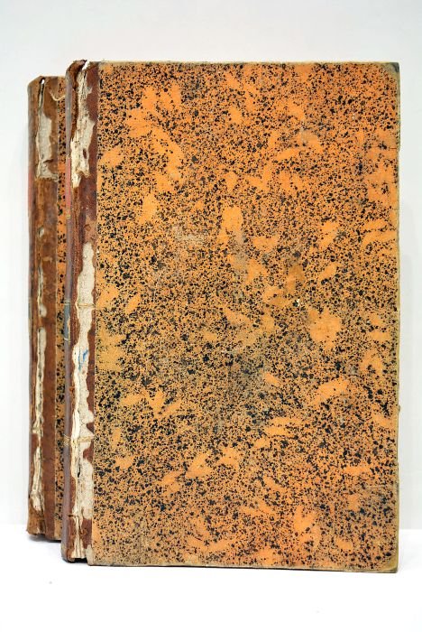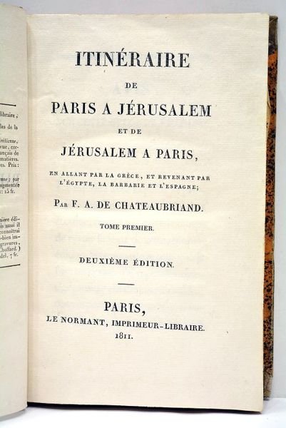 3 volumes. CIX. 277 pages. + 2 feuillets. 413 pages. + 2 feuillets. 370 pages. 8 pages. Dans le tome 3 : 1 planche dépliante ; 6 pages numérotées avec étoiles entre page 216 et 217. Manque la carte dépliante. (20x13cm). Demi-basane à petits coins de vélin. Dos orné et doré. Pièces de titre et de tomaison. Manques aux charnières et aux dos. Frottements. Salissures. Quelques rares taches à l'intérieur. Bon exemplaire par ailleurs, excellent état intérieur. Avec le fac-similé du contrat, en arabe, entre Chateaubriand et le patron d'un bateau qui l'emmena de Jaffa à Saint-Jean-d'Acre. Excellent état intérieur. Manque la carte dépliante.