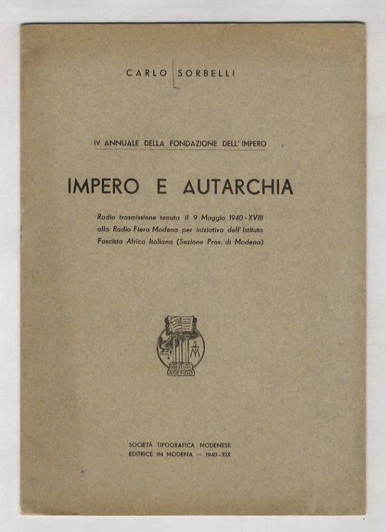 IV annuale della fondazione dell'Impero: Impero e autarchia. Radio trasmissione tenuta il 9 maggio 1940-XVIII alla Radio Fiera Modena per iniziativa dell'Istituto Fascista Africa Italiana (Sezione Prov. di Modena).