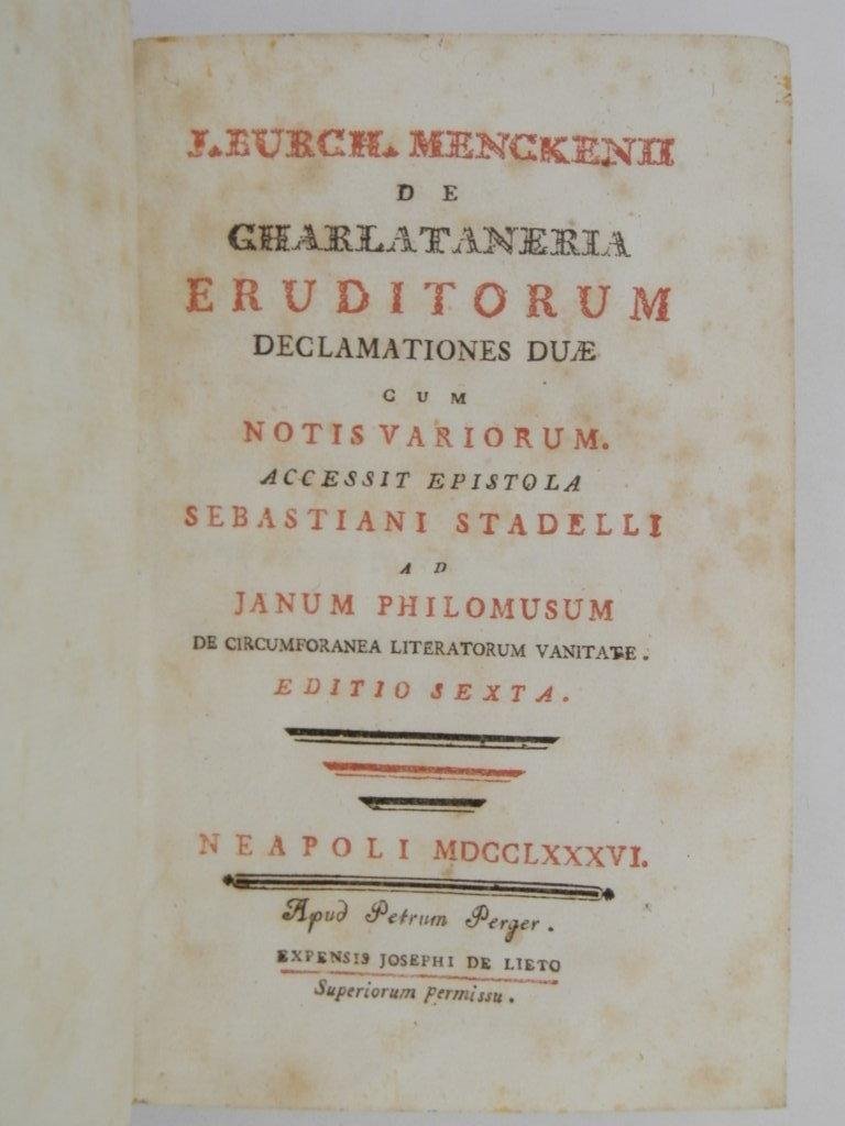 J. Burch. Menckenii De ciarlataneria eruditorum declamationes duae cum notis variorum accessit epistola Sebastiani Stadelli ad Janum Philomusum de circumforanea literatorum vanitate. Editio Sexta