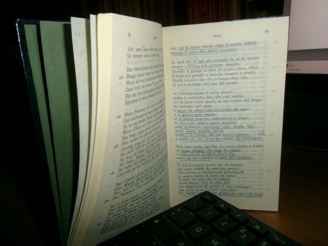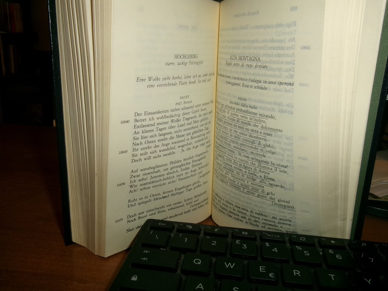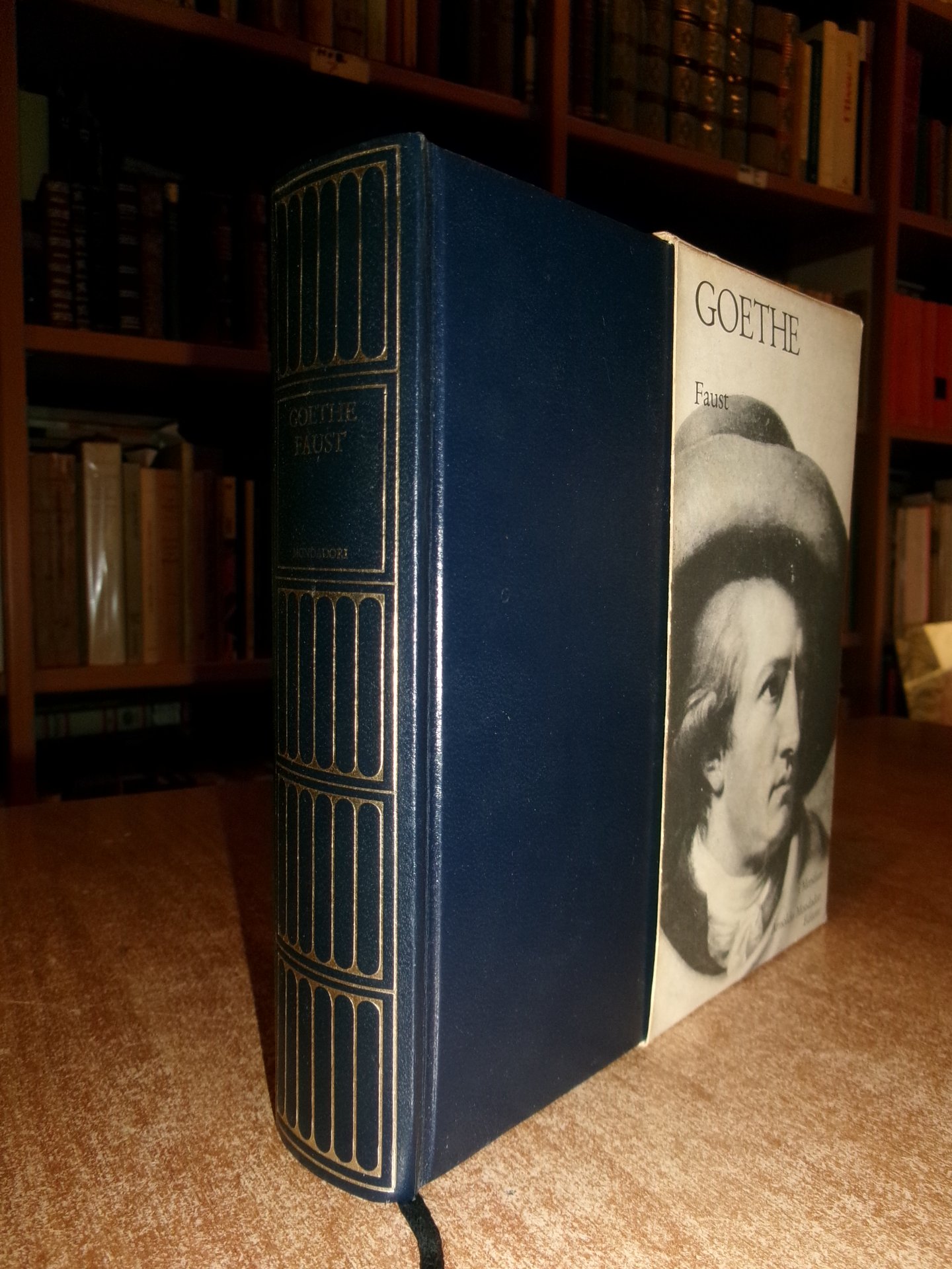 J. W. GOETHE. FAUST. Milano, Arnoldo Mondadori (I Meridiani), 1982. In-16°, similpelle con fregi e titolo in oro al dorso, segnalibro in cotone e astuccio. XL, 1138, (2) pp. Il libro è classificato in buono stato di conservazione perchè sono presenti due dediche e numerose sottolineature a penna. Testo italiano/tedesco. Neg. teatr. mob. L
