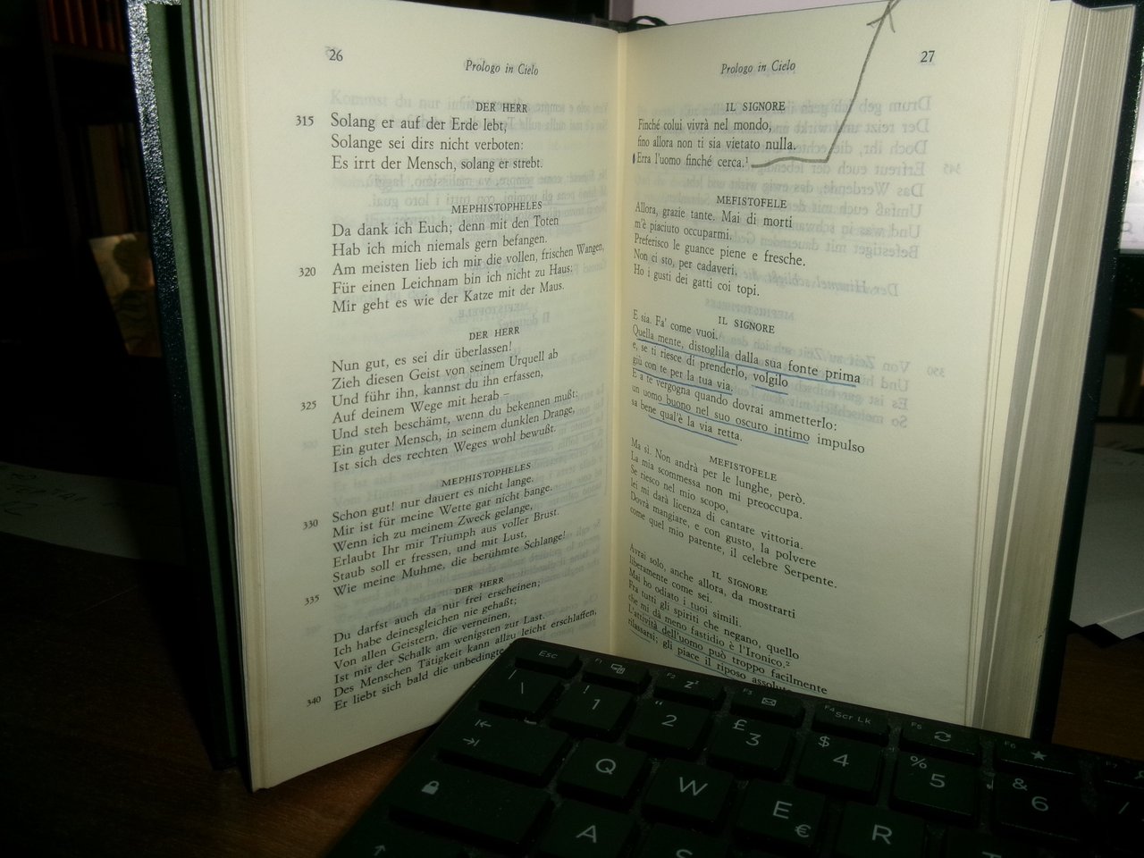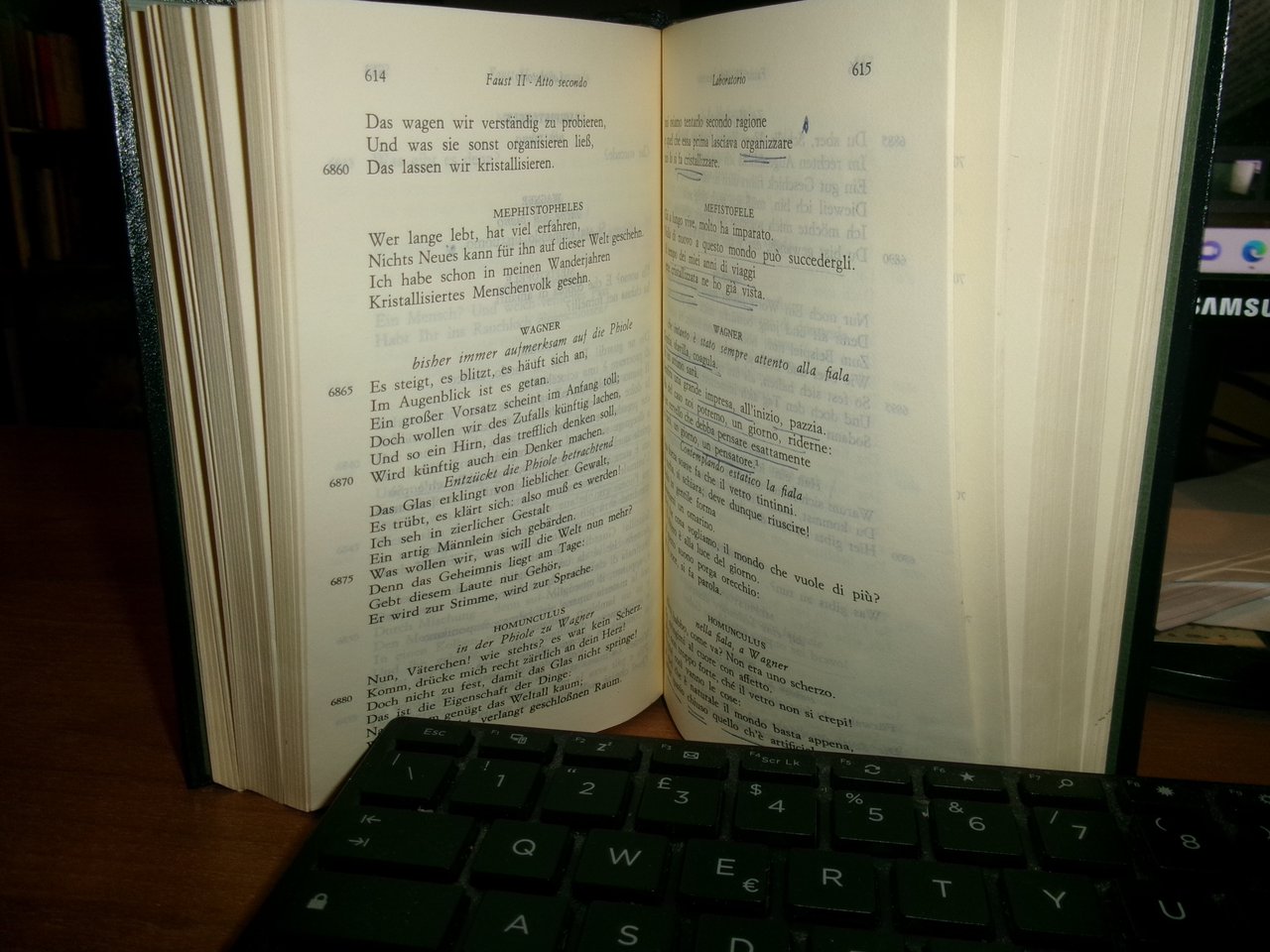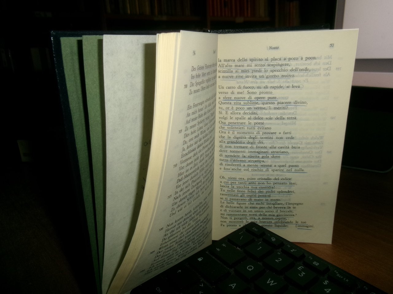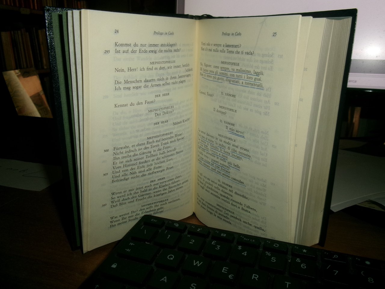 J. W. GOETHE. FAUST. Milano, Arnoldo Mondadori (I Meridiani), 1982. In-16°, similpelle con fregi e titolo in oro al dorso, segnalibro in cotone e astuccio. XL, 1138, (2) pp. Il libro è classificato in buono stato di conservazione perchè sono presenti due dediche e numerose sottolineature a penna. Testo italiano/tedesco. Neg. teatr. mob. L
