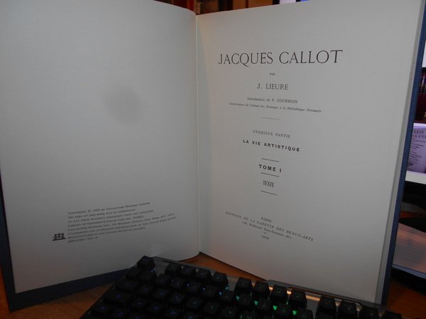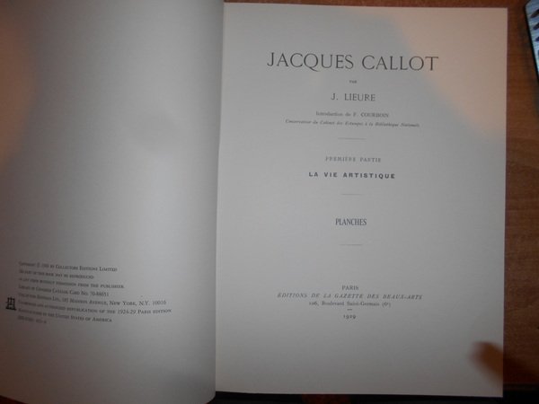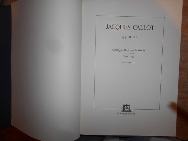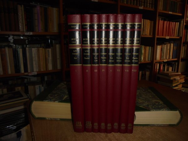 by J. LIEURE. New York, Collectors Editions LTD, 1969. JACQUES CALLOT. Introduction de F. Courboin Conservateur du Cabinet des Estampes à la Bibliothèque Nationale. 8 volumi in-4° grande, m. pelle bordeaux e tela con titoli in oro ai dorsi. Tome I. première partie. La vie artistique Texte. vii, 126 pp. + appendice 129 pp.; Volume II. Life of the Artist PLATES. (vi), pp. con 306 riproduzioni anche a piena pagina. Volume III. Catalog of the Graphic Works Text I-299. 122 pp.; Volume IV. Catalog of the Graphic Works Plates I-299. con 299 riproduzioni anche a piena pagina, alcune ripiegate.; Volume V. Text 300-652. 106 pp.; Volume VI. Plates 300-652. anche a piena pagina ed alcune ripiegate.; Volume VII. Text 653-1428. 128 pp.; Volume VIII. Plates 653-1428. anche a piena pagina ed alcune ripiegate. Opera completa e come nuova. Edizione identica a quella di Parigi del 1929. Uff. E - V - 7
