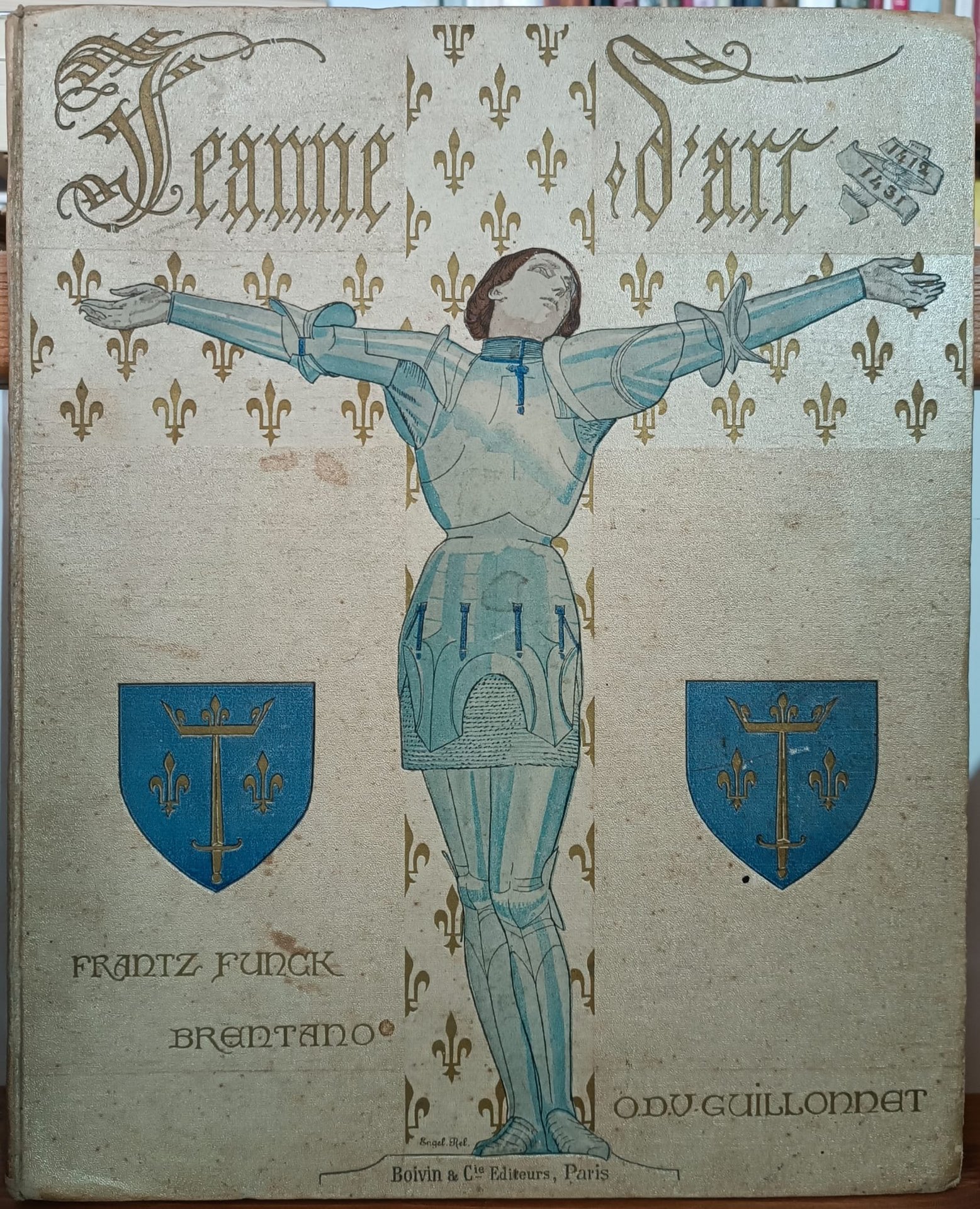Folio 38 x 30, pp. 83, bella legatura in piena tela con figure a colori della Santa e del suo stemma araldico, illustrazioni a piena pagina nel testo che descrivono la vita di Santa Giovanna D'Arco. Testo in lingua francese. Dedica autografa all'occhietto datata "Noel de la Victoire 1918". Qualche leggera ingiallitura a prime e utlima carta. Normali segni del tempo. OTTIMO