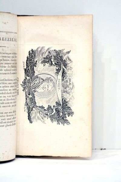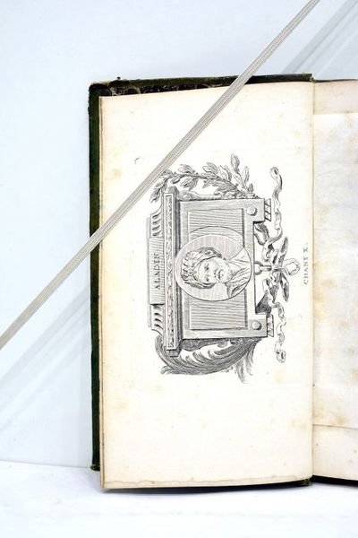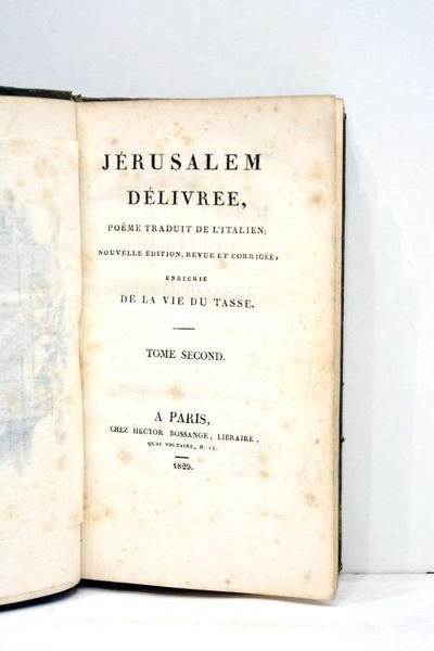 Tome 2 seul. Frontispice. 309 pages. 10 planches illustrées. (18x10,5cm). Pleine basane verte du temps. Dos lisse finement décoré. Pièces de titre et tomaison maroquin rouge. Ornements dorés aux encadrements des plats. Filet doré sur les coupes. Tranches et gardes marbrées. Reliure un peu usagée. Quelques frottements sur le dos et sur les plats. Coiffes légèrement éimées. Taches sur les plats. Coins émoussés. Rousseurs éparses à l'intérieur. Bon état général. Séduisant exemplaire agréablement relié à l'époque dans une pleine basane verte au dos finement décoré. Mérite une restauration. Portrait en frontispice. Cet deuxième volume contient les chants 10-20 de le poème Jérusalem délivrée.