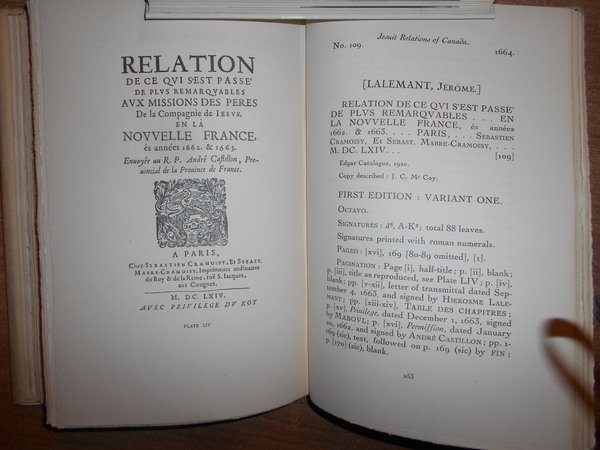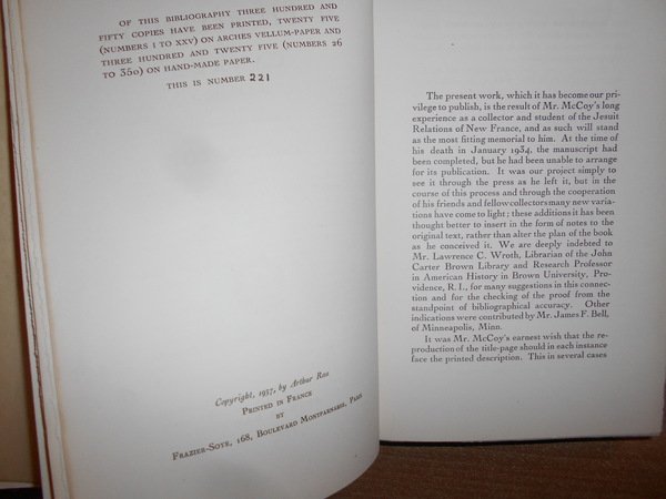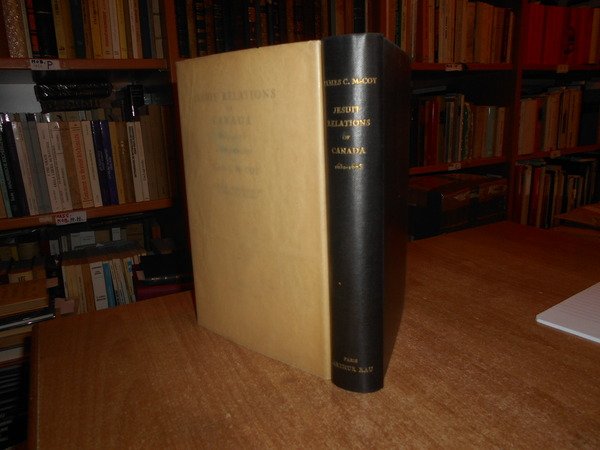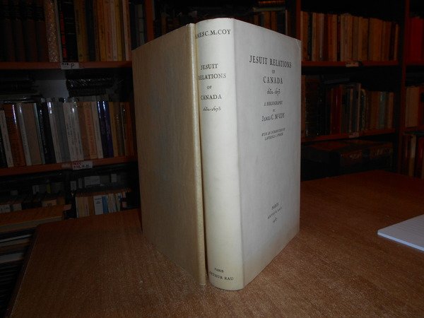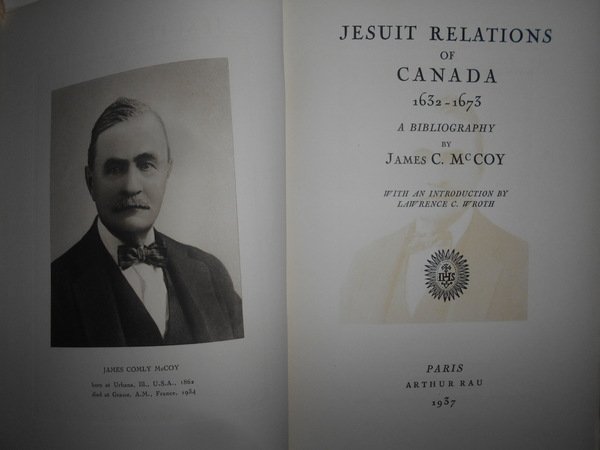 JAMES C. Mc COY. Paris, Arthu Rau, 1937. JESUIT RELATIONS of CANADA 1632-1673 a Bibliography. With an introduction by Lawrance C. Wroth. In-8°, tela bleu con titolo in oro al dorso, sovracopertina con pellicola trasparente. xv, (1), 310, (36) pp. con LXV tavole. Ottimo esemplare con barbe e ritratto dell' Autore in antiporta. Tiratura numerata di 350 copie (n° 221). Uff. B - II - 6 - 2
