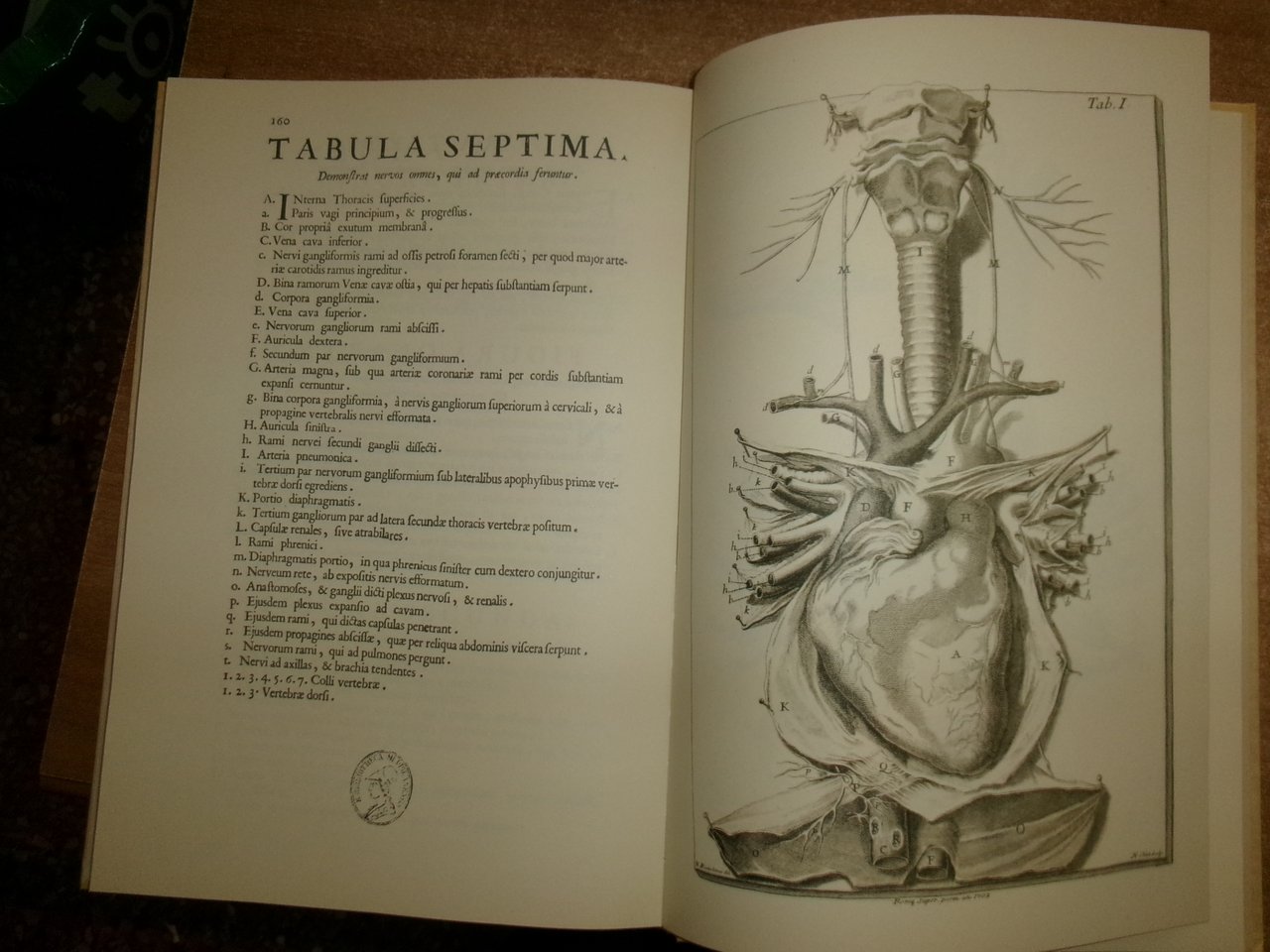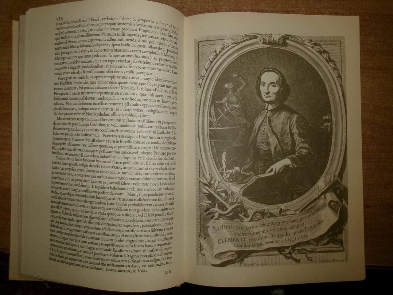Joannis Mariae Lancisii a secretiori cubiculo & archiatri pontificii de motu cordis et aneurysmatibus opus posthumum in duas partes divisum sanctissimo patri Clementi XI felicis recordationis dicatum. Copia anastatica dell'originale impresso nel 1728. Anno d'impressione non specificato; edizione unica fuori commercio in esclusiva ai Sigg. Medici. Lingua latino. Opera in cofanetto cartonato morbido muto. In-4°, cartonato edit. viii, 160 pp. con 7 tavole f.t. Come nuovo in astuccio muto. Uff. C - I - 5 - 2