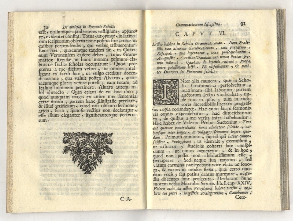 Venetiis, typis Laurentii Basilii, 1718, in-8, br. marmorizzata ottocentesca, tagli spruzzati, pp. [14], 86, [2]. Interessante dissertazione sulle scuole romane di grammatica. Non comune: solo 5 esemplari censiti in ICCU. Non è stata legata la carta che precedeva il frontespizio, probabilmente bianca.