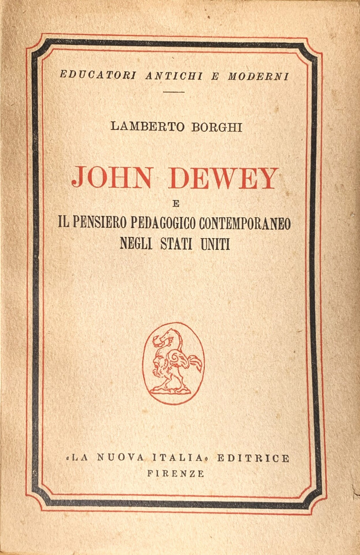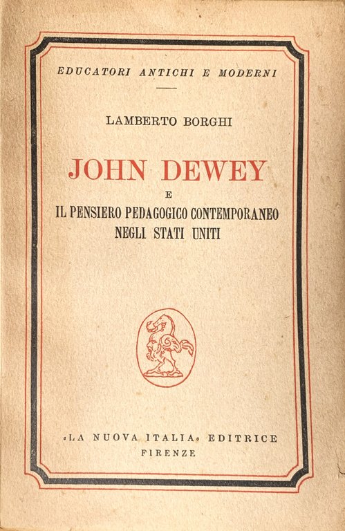 I ed. (13 giugno 1951). Collezione "educatori antichi e moderni" LXXIX. VIII piccolo/ VIII+/ brossura in cartoncino ruvido écru con grafica in nero e rosso. Stato buono (copertina e pagine brunite - firma di possesso ad inchiostro blu all'occhiello - timbri bibliotecari annullati). Indice: Avvertenza - Educazione s società nel pensiero di John Dewey - Lo sviluppo della pedagogia sociale del Dewey - John Dewey e la prima guerra mondiale. La critica di Randolph Bourne - La critica dei politici e dei religiosi (La nuova siniostra radicale nella seconda guerra mondiale - La Società degli Amici) - La critica degli educatori e dei filosofi (La Scuola di Harvard - Lo Harvard Report - La Scuola di Chicago e il movimento tradizionalista) - La scuola di Dewey nei suoi ultimi sviluppi (Sidney Hook - Horace M. Kallen - John L. Childs - William Heard Kilpatrick) - Conclusione - Appendice. Lo Stato, la Chiesa e la Scuola negli stati Uniti - Indice dei nomi.