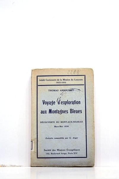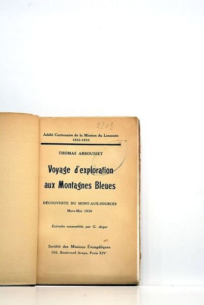 Jubilé Centenaire de la Mission du Lessouto 1833-1933. Voyage d'exploration aux Montagnes Bleues. Découverte du Mont-aux-sources. Extraits rassemblés par G. Atger.