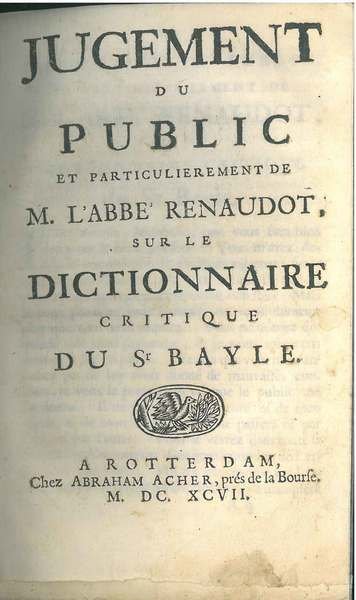 Jugement du public et particulierment de L'abbé Renaudot sur le dictionnaire critique de Sr. Bayle