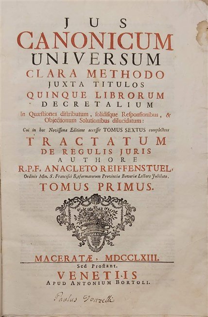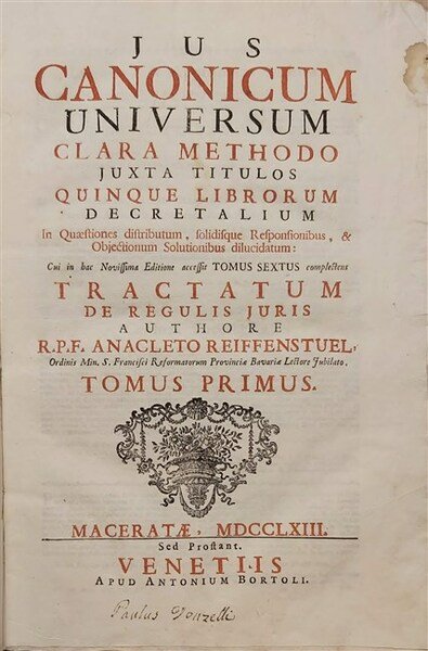 JUS CANONICUM UNIVERSUM clara methodo juxta titulos quinque Librorum Decretalium. In questiones distributum, solidisque Responsionibus & Objectionum Solutionibus dilucidatum. Cui in hac Novissima Editione accessit Tomus Sextus complectens Tractatum de regulis juris.