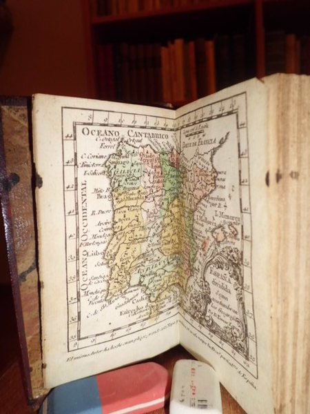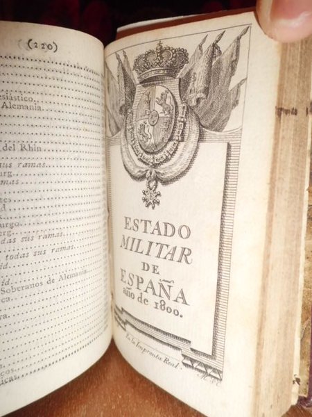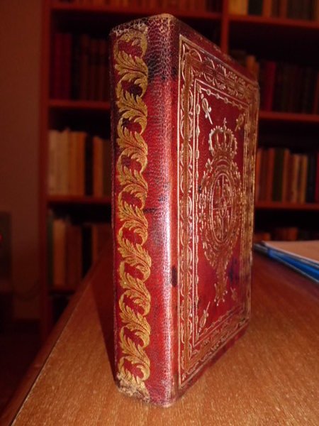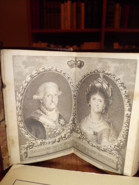 KALENDARIO manual y guia de forasteros en Madrid, para el año de 1800. En la Imprenta Real, 1800. 2 volumi in - 16° (cm 11,5 x 7) rilegati assieme in piena pelle rossa coeva alle armi reali, artisticamente decorata in oro al dorso e nei piani, taglio dorato. I: 220 pp. con due ritratti del Re e della Regina di Spagna incisi in rame da Rafael Estero nel 1799 da dipinti di Francisco Goya, e una carta geografica della Spagna colorata a mano fuori testo. Frontespizio inciso con l' arme reale. II: Frontespizio inciso come l' atro, 215, (1) pp. Bell' esemplare. Com'è noto tutti gli almanacchi di questa raccolta sono rari. Il presente è impreziosito della splendida legatura e dei ritratti che riproducono fedelmente i dipinti di Goya. Cfr. Palau, 126997 e 83331.
