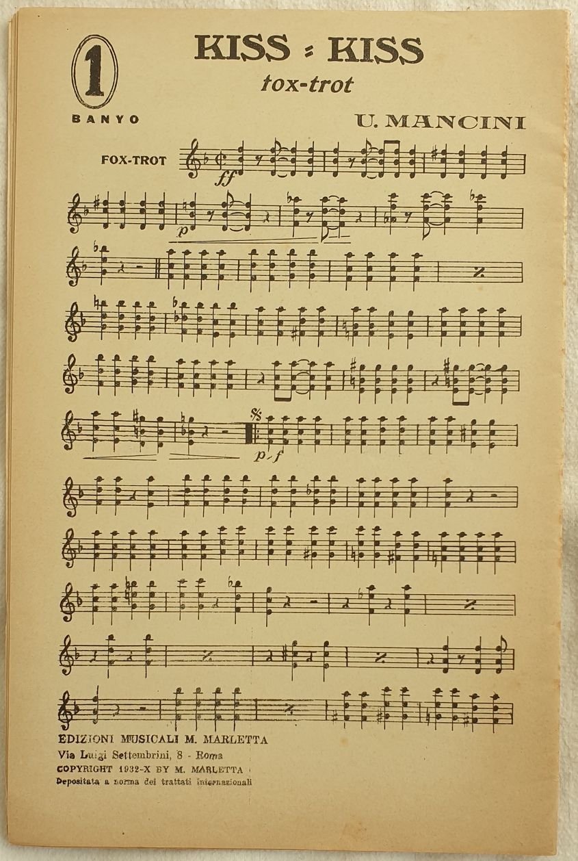 Partitura per orchestra del 1932 delle melodie "Kiss kiss" di Mancini e "Song of love" di Siciliani.<BR>Copertina assente. GENERE: Fox trot STRUMENTI: violino, violoncello, contrabasso, sassofono, tromba, trombone ANNO: 1932 DIMENSIONI: In 8. cm 27x18 PAGINE: pp. 28 CONDIZIONI: Otime condizioni. Ex libris in copertinaScore for orchestra of 1930 of the melodies "Kiss kiss" by Mancini and "Song of love" by Siciliani. Editorial cover lacks.<BR>MUSIC: Fox trot STRUMENTI: violin, violoncello, contrabbass, saxophone, trumpet, trombone<BR>YEAR: 1932 SIZE: In 8. cm 27x18 PAGES: pp. 28 Ex libris in the cover