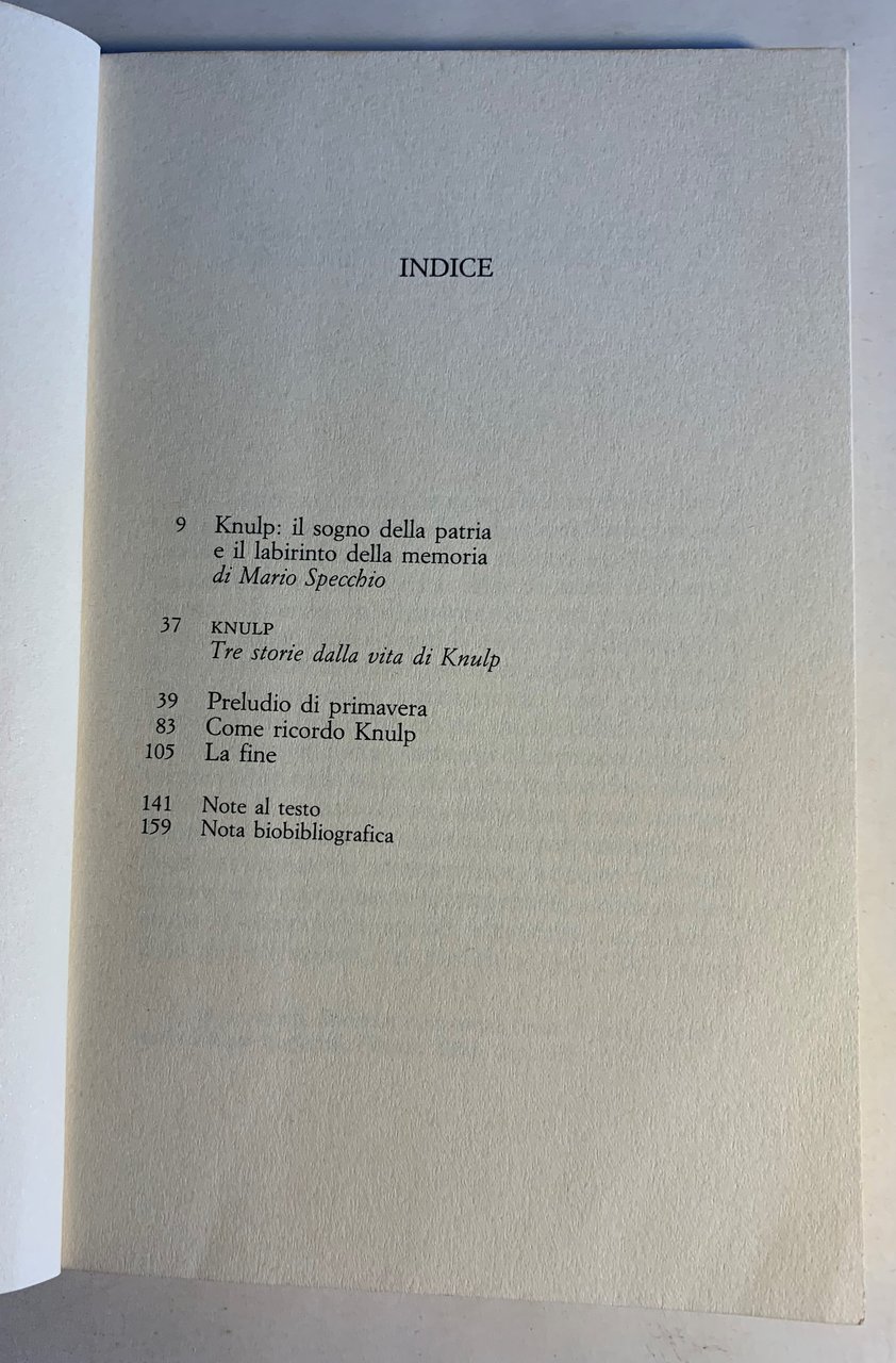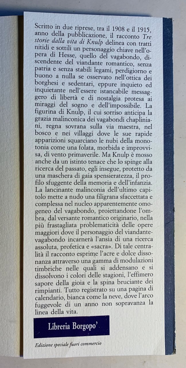 ed. speciale fuori commercio: settembre 1992 (ed. originale: Knulp. Drei Geschichten aus dem Leben Knulps, 1915 - I ed. italiana: Storia di un vagabondo, traduzione di Ervino Pocar, Milano, Martelli 1950 - I ed. Marsilio: 1989). A cura di Mario Specchio. Letteratura universale Marsilio - Gli Elfi, Collana di Classici tedeschi diretta da Maria Fancelli. XVI/ 176/ brossura in cartoncino ruvido avorio con ampi risvolti, grafica in blu cadetto, avorio e nero e con illustrazione a colori al primo piatto (Edvard Munch, Ragazze sul ponte, 1901, Oslo, Nasjonal Galleriet. Grafica: Orazio Pugliese). Stato buono (usura della copertina, in particolare ai margini - copertina e pagine leggermente brunite).