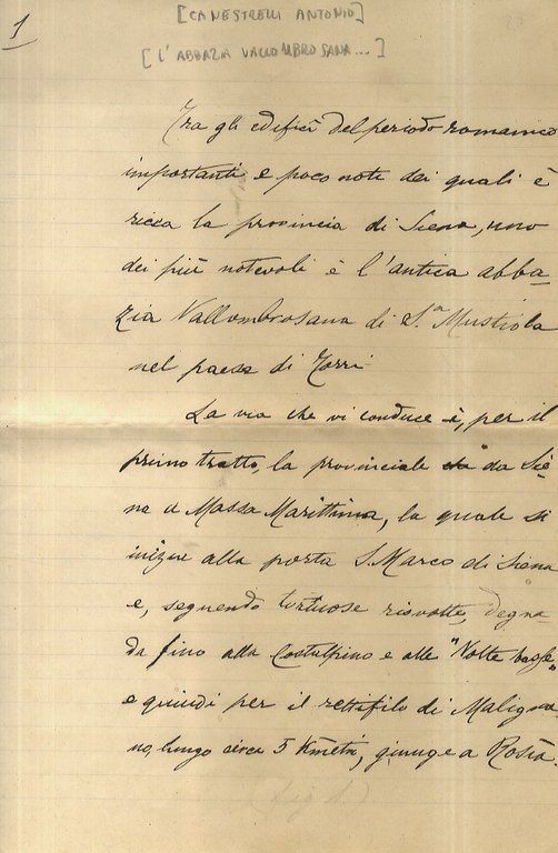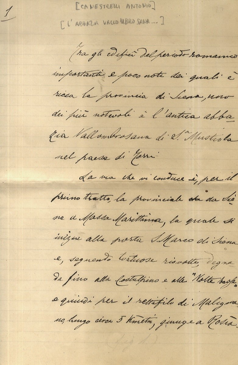 [Prob. Firenze, anni '10 del '900]. manoscritto autografo su carta, non firmato, attribuibile in base alla provenienza e alla calligrafia ad Antonio Canestrelli, in-4 piccolo, carte 20, sciolte, compilate solo al recto, paginazione manoscritta autografa dell'autore. Si tratta di un lungo articolo (probabilmente nella sua forma definitiva, non essendo presenti correzioni), forse uscito su qualche rivista. Nel 1922 fu edito a Siena uno studio del Canestrelli sull'abbazia di Torri, ma il testo non corrisponde a questo.