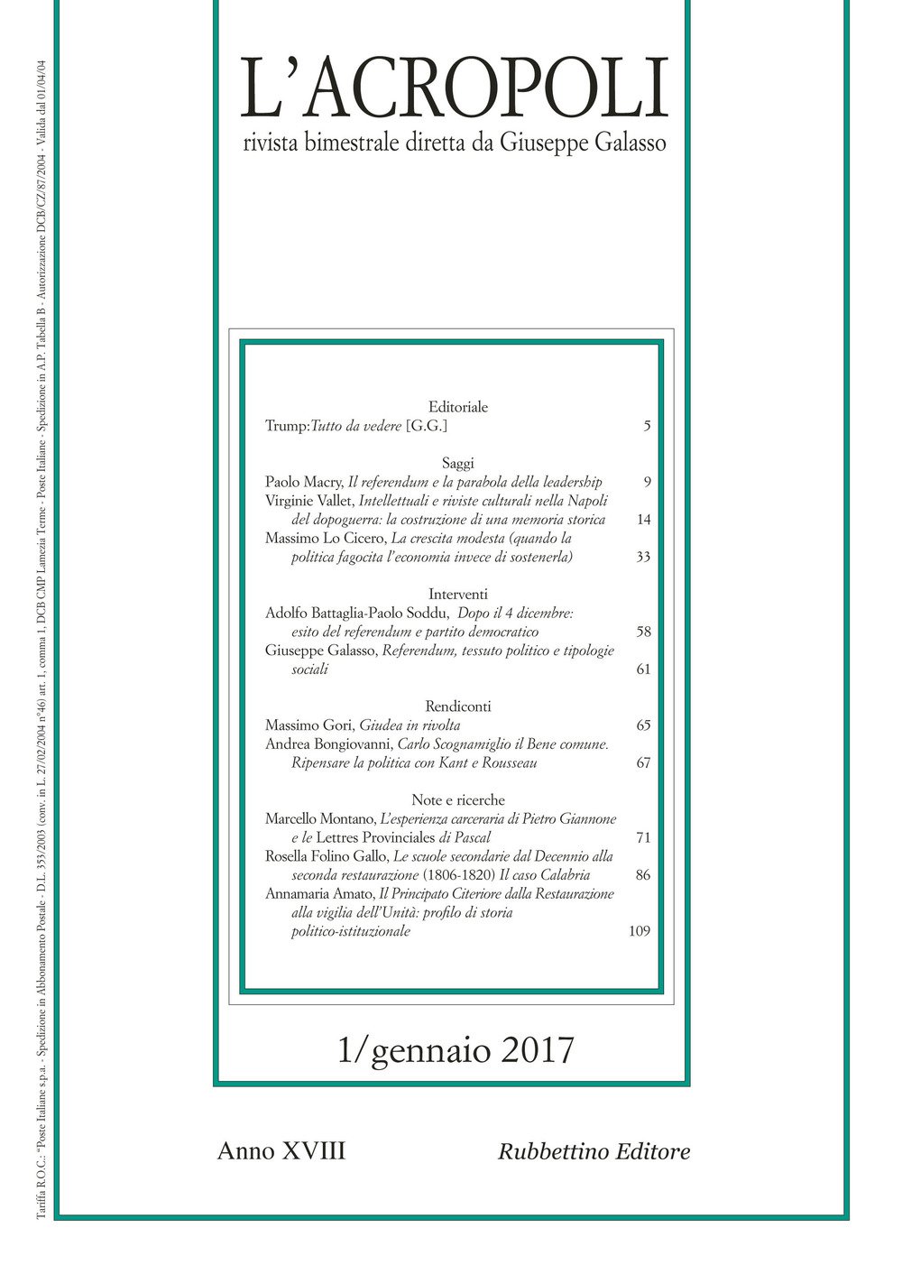 "L'Acropoli" è una rivista bimestrale di politica e varia cultura diretta da Giuseppe Galasso. Il titolo della testata riprende quello della rivista di Adolfo Omodeo, che la diresse per due anni, nel biennio 1945-46, fino alla morte. Il periodico attuale, fondato nel 2000, è una rivista di cultura varia, ma, soprattutto, di alta cultura politica. Gli intenti e il programma della rivista sono esposti dettagliatamente nel primo numero della rivista stessa (1/2000). Tra i collaboratori, tra l'altro, si contano validi intellettuali italiani e stranieri, mentre il vincolo di unitarietà e di intervento critico è garantito dalla personalità scientifica del direttore.