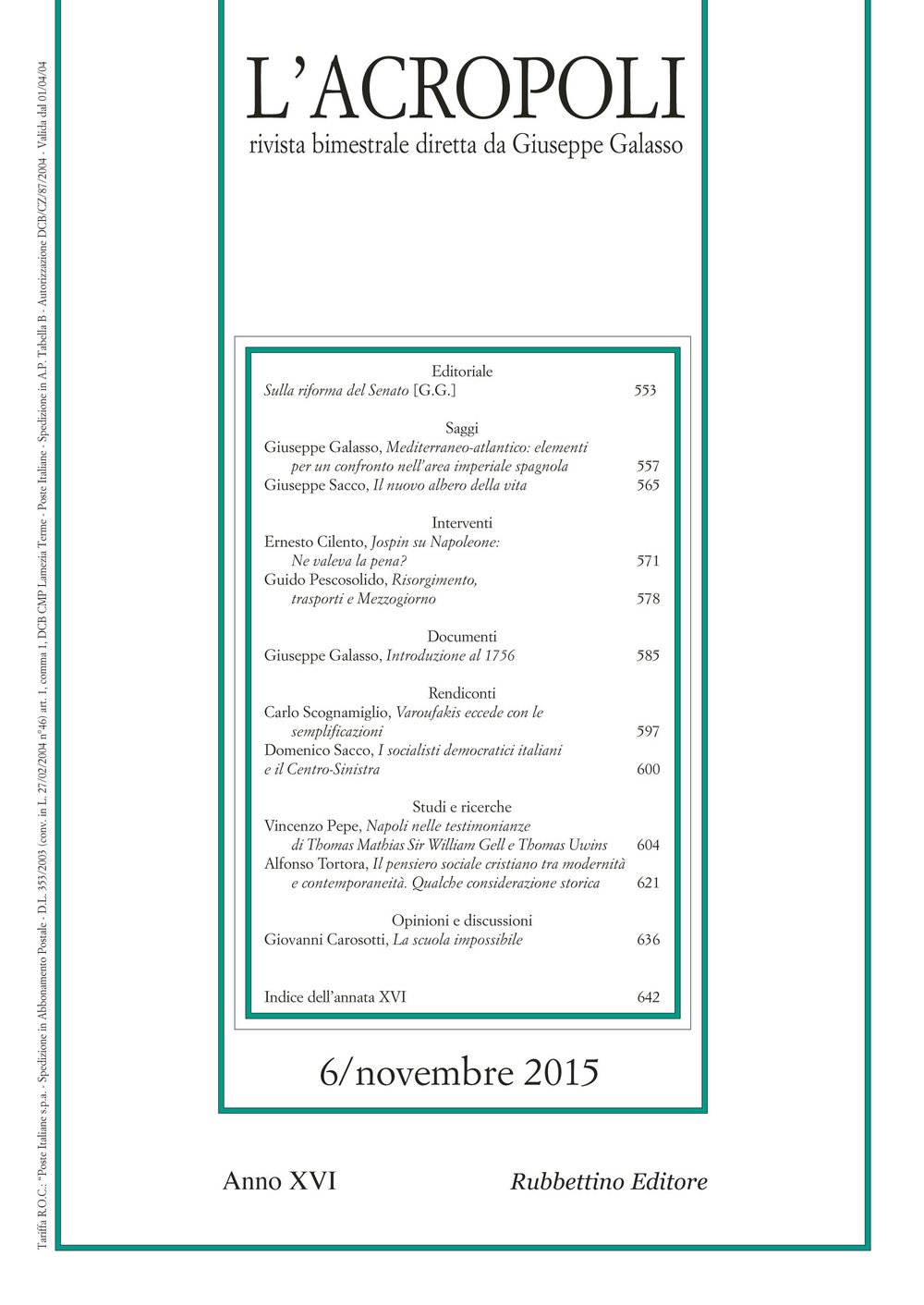 Si tratta del sesto numero del 2015 della rivista bimestrale di politica e varia cultura diretta da Giuseppe Galasso.