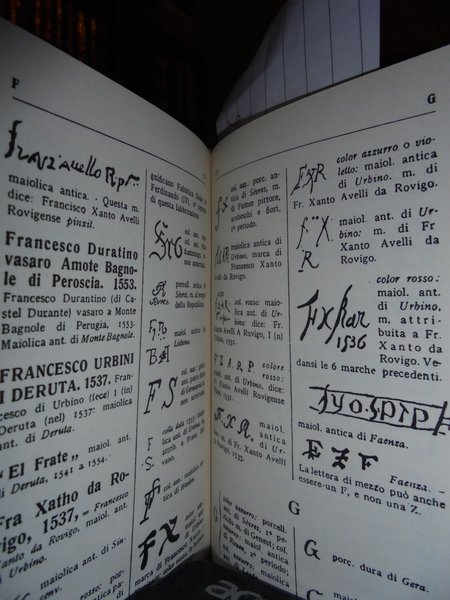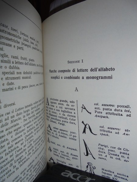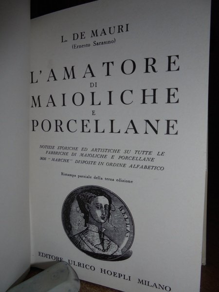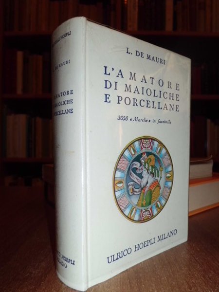 L' Amatore di Maioliche e Porcellane. L. De Mauri. Milano, Hoepli, 1976. Ristampa parziale della terza edizione. Notizie storiche ed artistiche su tutte le fabbriche di maioliche e porcellane 3656 "Marche" disposte in ordine alfabetico. In - 16° picc. cartonato edit. con sovracopertina in acetato. 535 pp. con 3656 Marche in facsimile. Libro molto ben conservato. Neg. mob. 5