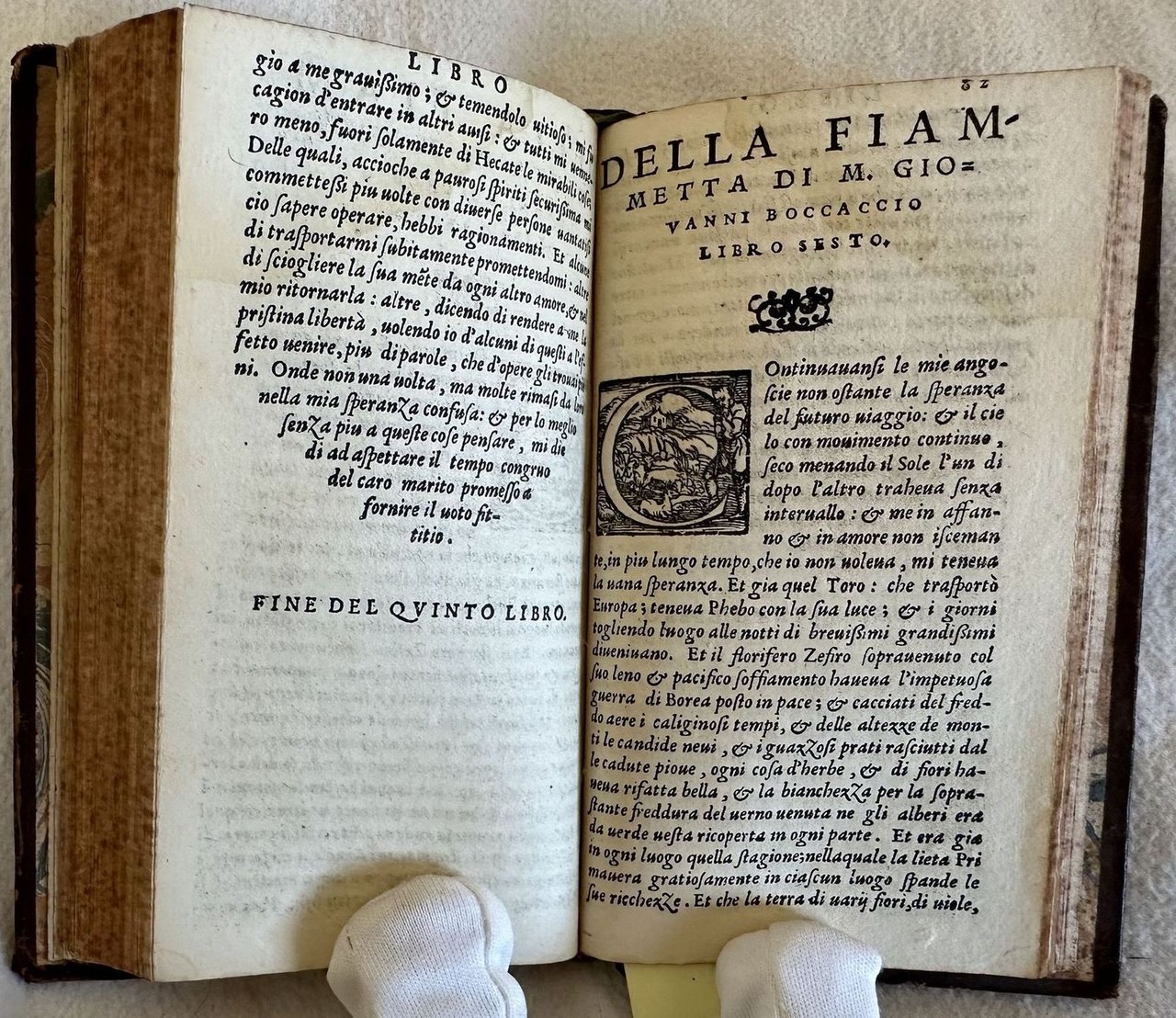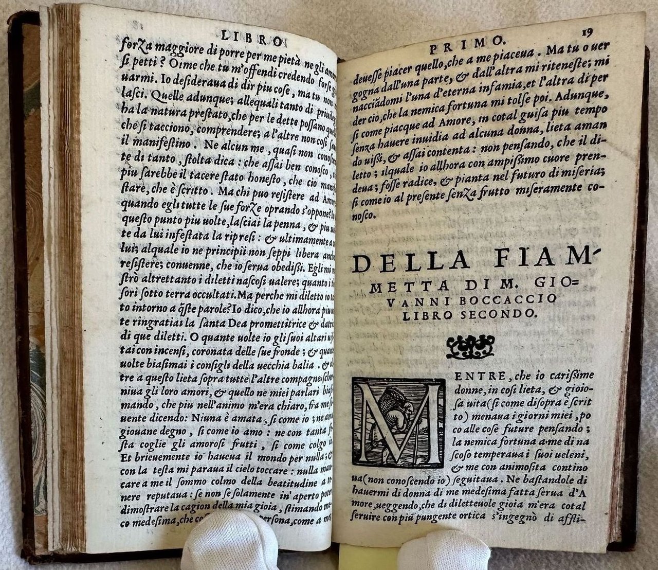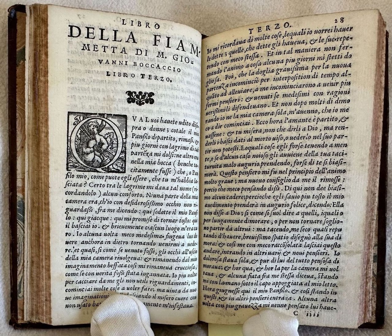 Edizione del 1551 del celebre romanzo psicologico di Giovanni Boccaccio (1313-1375). L'opera, in prosa si presenta come un lungo monologo confessione di una ragazza napoletana che descrive la sua passione per Panfilo, un mercante fiorentino. Opera dedicata alle gentildonne di Casale di Monferrato da parte dello stampatore Gabriel Giolito, una delle primissime dediche, che in seguito divennero frequenti caratterizzando lo stile dell'editore veneziano (Cfr. "The Publisher Gabriel Giolito de Ferrari, Female Readers, and the Debate about Women in Sixteenth-Century Italy" Androniki Dialeti.). Finissimi capilettera decorati. Tagli marmorizzati. Numerazione singola. In buone condizioni. Copertina in piena pelle settecentesca con tiolo e decorazioni in oro al dorso in buone condizioni generali con lievi usure ai margini e dorso. Legatura in buone condizioni. All'interno le pagine si presentano in buone condizioni con rare fioriture. Piccola parte mancante al frontespizio. Lievi gore d'umidità marginale. In 8. Dim. 12,5x7,5 cm. Pp. 99+(6). Edition of 1551 of the famous psychological novel by Giovanni Boccaccio (1313-1375). The work in prose isb a long monologue confession fo a neapolitan girl that describes his passion for Panfilo, a florentine merchant. Work dedicated to the gentlewomen of Casale di Monferrato by the publisher Gabriel Giolito, one of the first dedications, that after this early attempts became a dinstictive carachteristic of the editor (Cfr. "The Publisher Gabriel Giolito de Ferrari, Female Readers, and the Debate about Women in Sixteenth-Century Italy" Androniki Dialeti.). Very fine decorated capital letters. Marbled fore-edges. Single numbering. In good conditions. Full parchment of 19th century with gilted title and decorations in the spine in good general conditions lightly worn in the extremities. Binding in good conditions. Inside pages are in good conditions with occasional foxing. Little missing parts in the title page. Light dump stains in the edges. In 8. Dim. 21x15 cm. Pp. 26+1 tav.