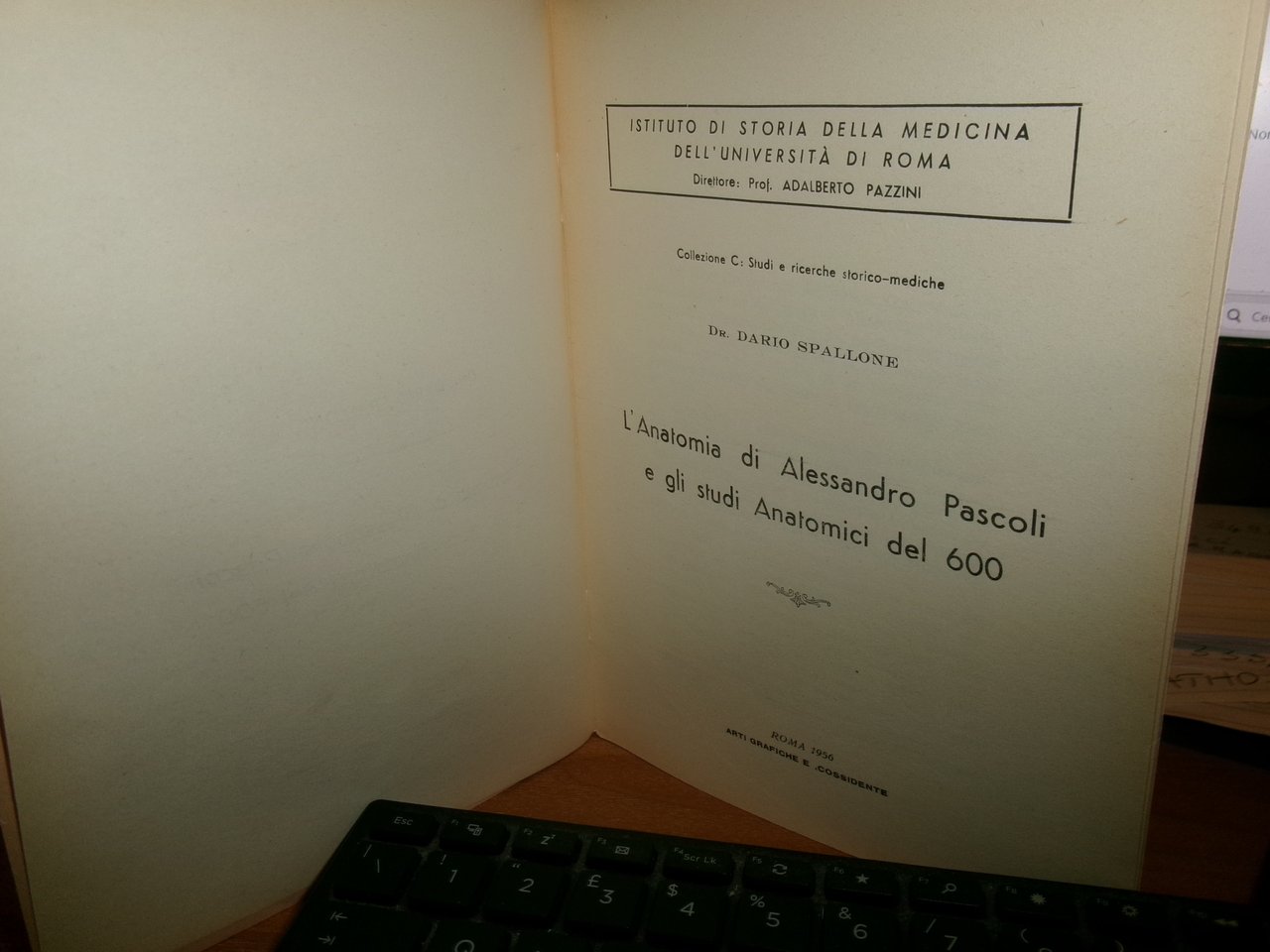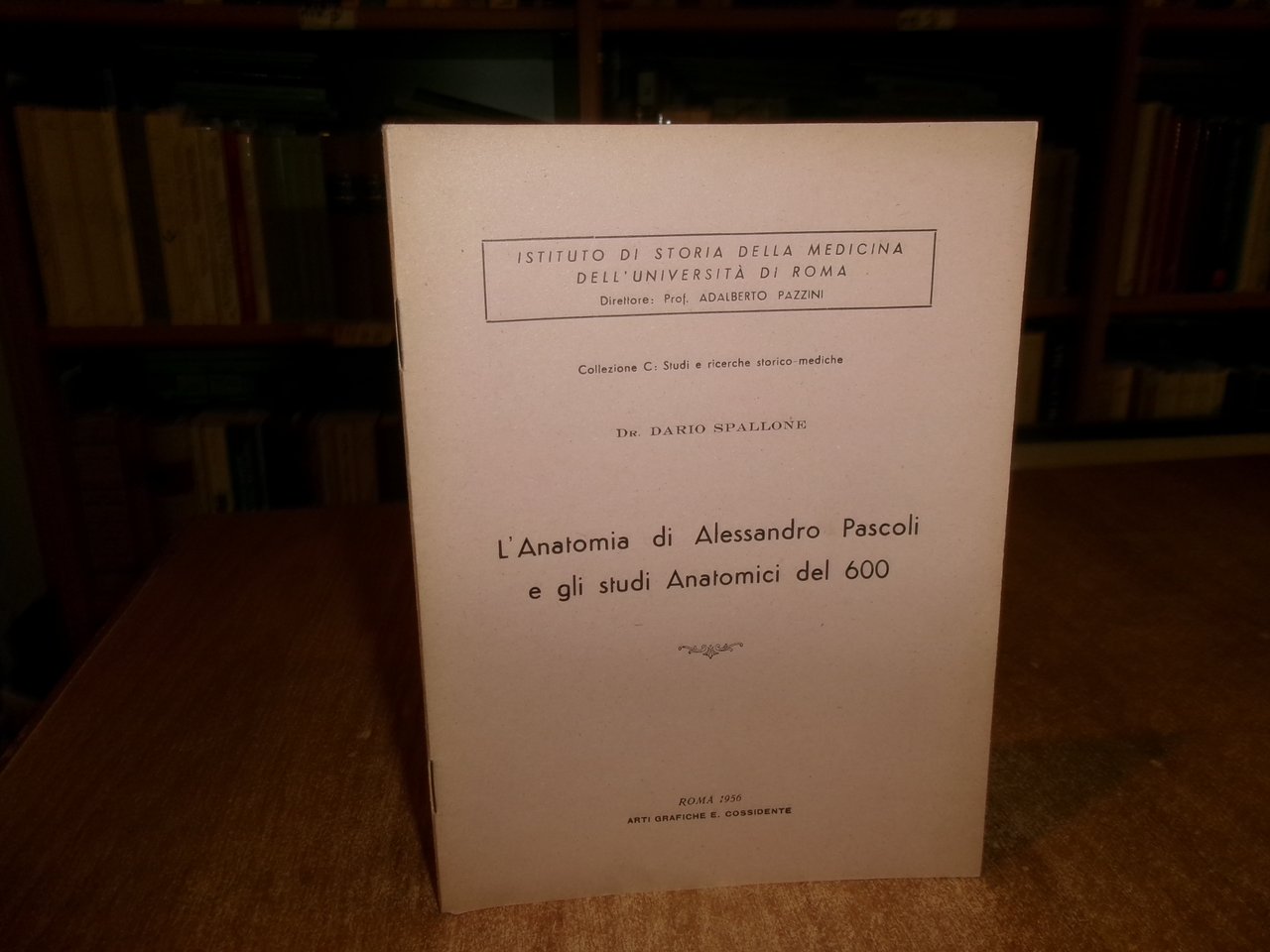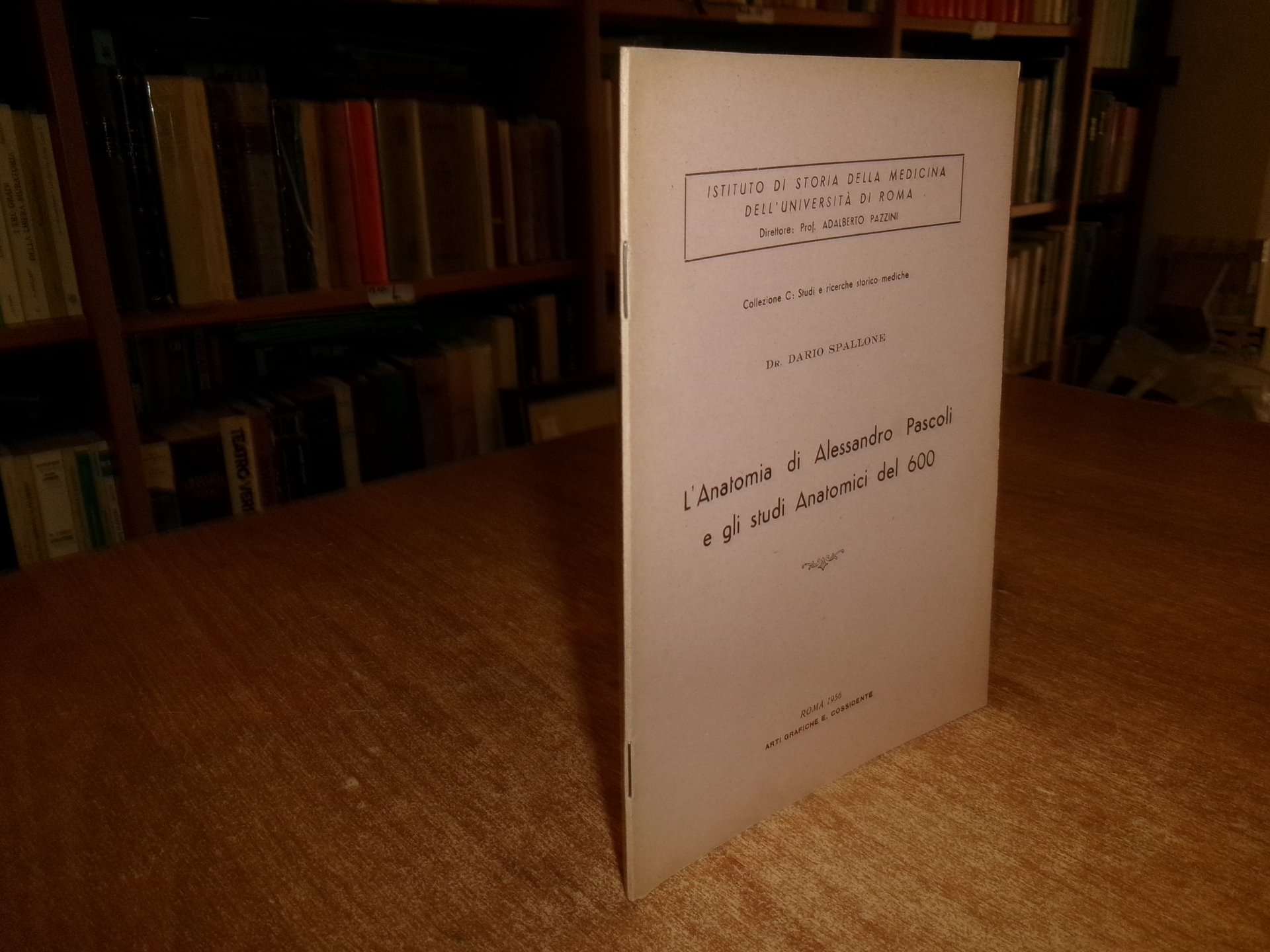 DARIO SPALLONE. Roma, Arti Grafiche E. Cossidente, 1956. L' Anatomia di Alessandro Pascoli e gli studi anatomici del 600. In-8°, br. orig. con punti metallici. 15 pp. Opuscolo in ottimo stato. Neg. mob. rosso entro busta trasp.