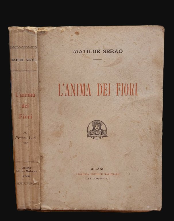 in-8, pp. 413, bross. edit. Prima rara edizione. Non un romanzo ma una raccolta di pensieri e racconti, ogni capitolo legato ad un fiore, che testimoniano la sensibilità e la parte forse più intima della scrittrice e giornalista di origine greca (Patrasso 1856 - Napoli 1927). Gambetti Vezzosi p.439. Tracce di polvere, copertina non bianchissima ma ottima copia. [554]