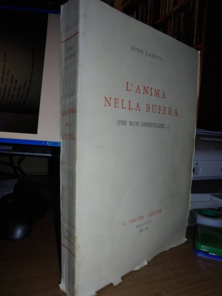Dino, Zanetti. Bologna, C. Galleri Editore, 1936. L' Anima nella bufera (per non dimenticare). In-8°, br. orig. 364 pp. con tavole in bianco e nero fuori testo. Esemplare ben conservato con barbe. Neg. storia sotto dietro