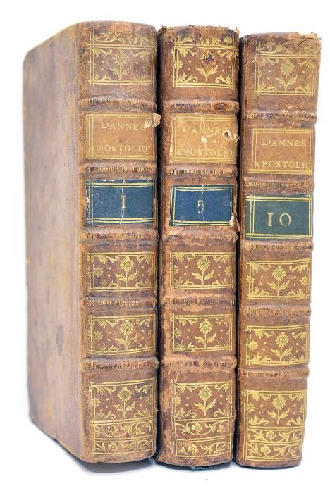 3 volumes. Tomes 1, 5 et 10 seuls. XX.460. + XVI. 448 pages. + VIII. 430 pages. (17x10,5cm). Pleine basane. Dos à nerfs orné. Pièce de titre. Accidents au dos. Quelques épidermures sur les plats. Coins émoussés. Rousseurs sans gravité à l'intérieur. Traces de mouillure sans perte au cinquième volume. Intérieur satisfaisant.