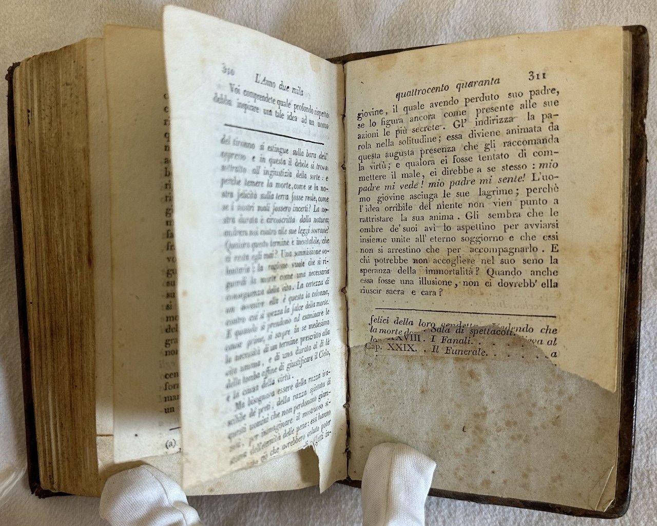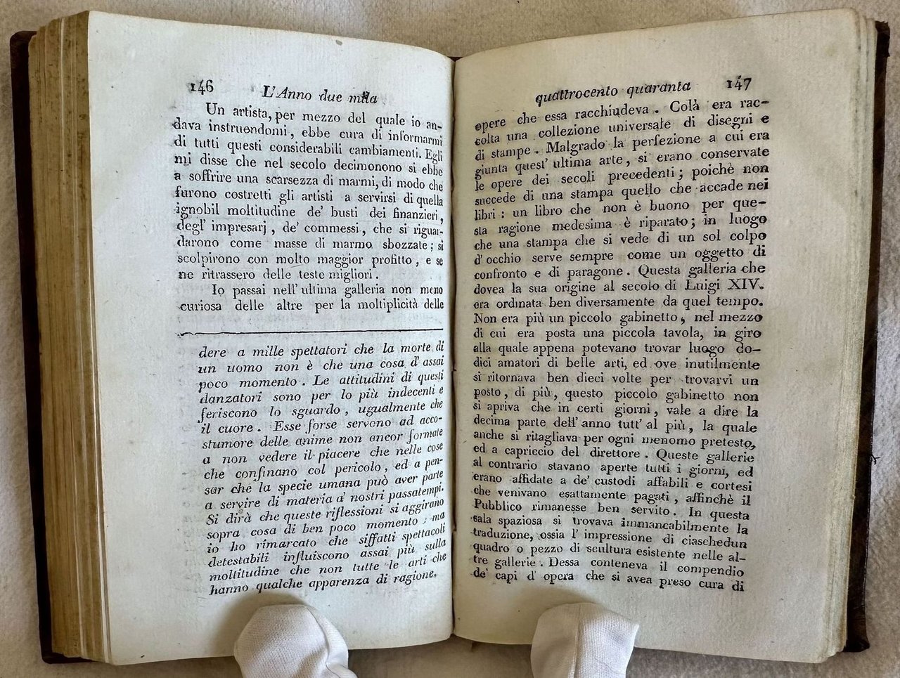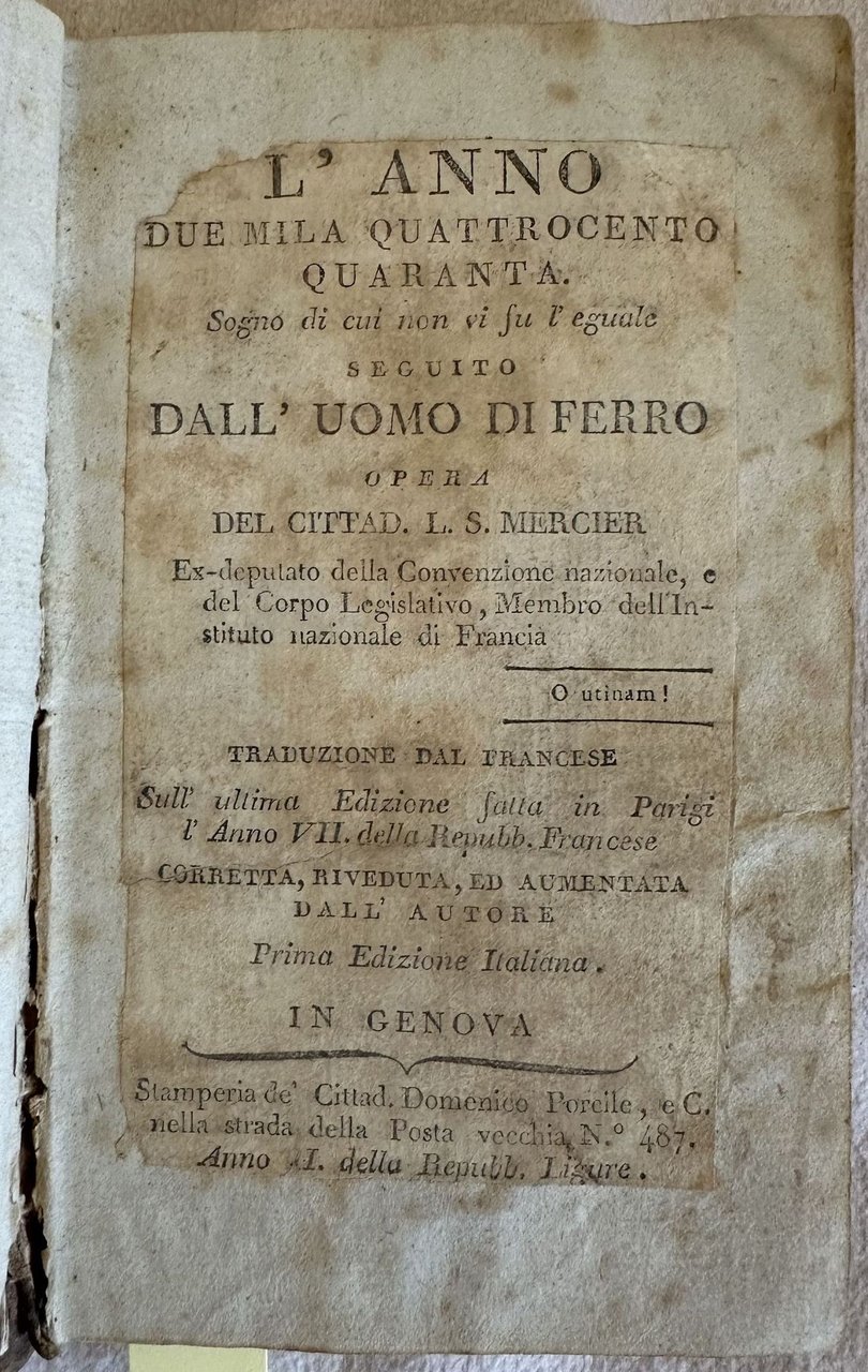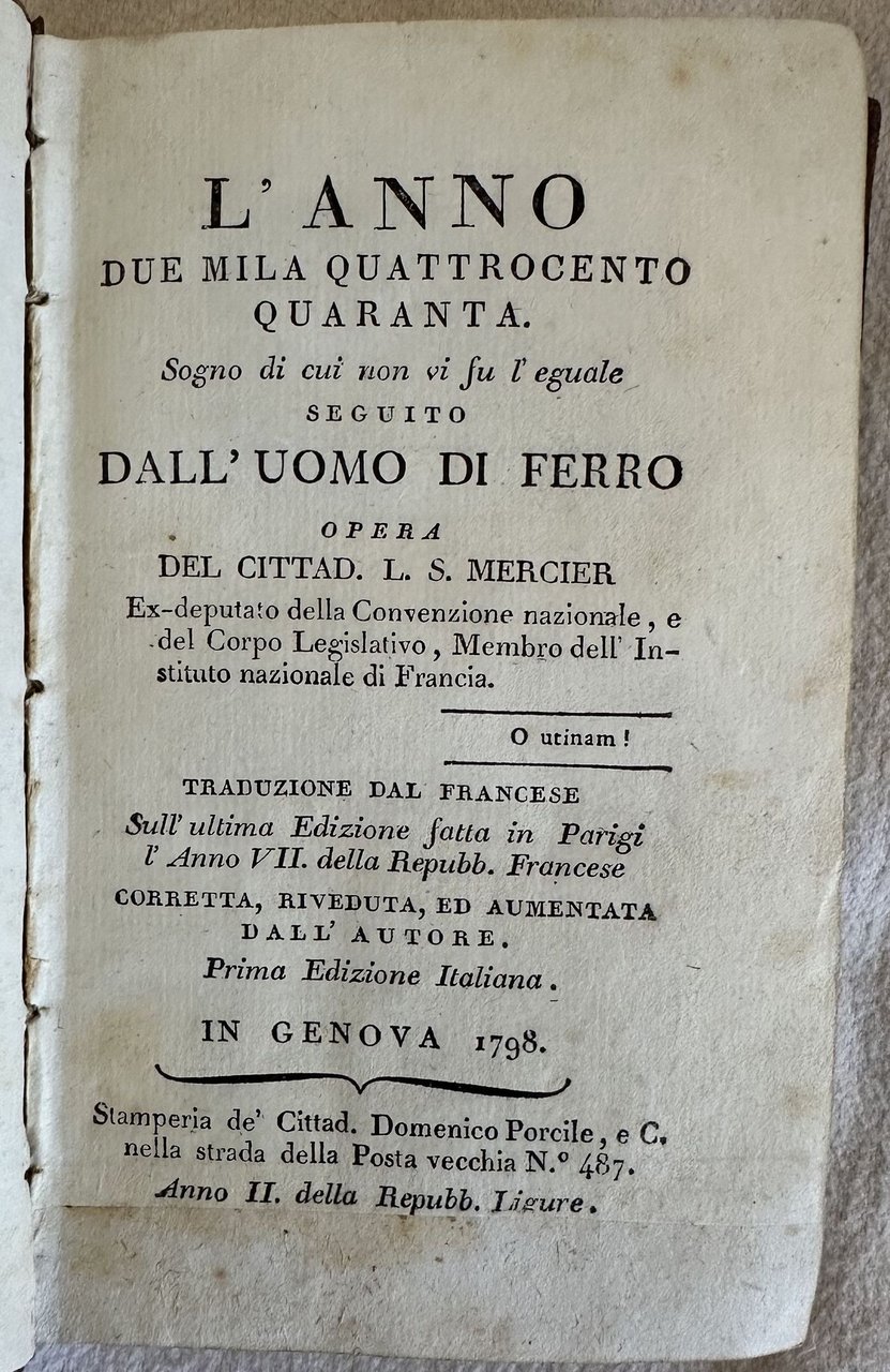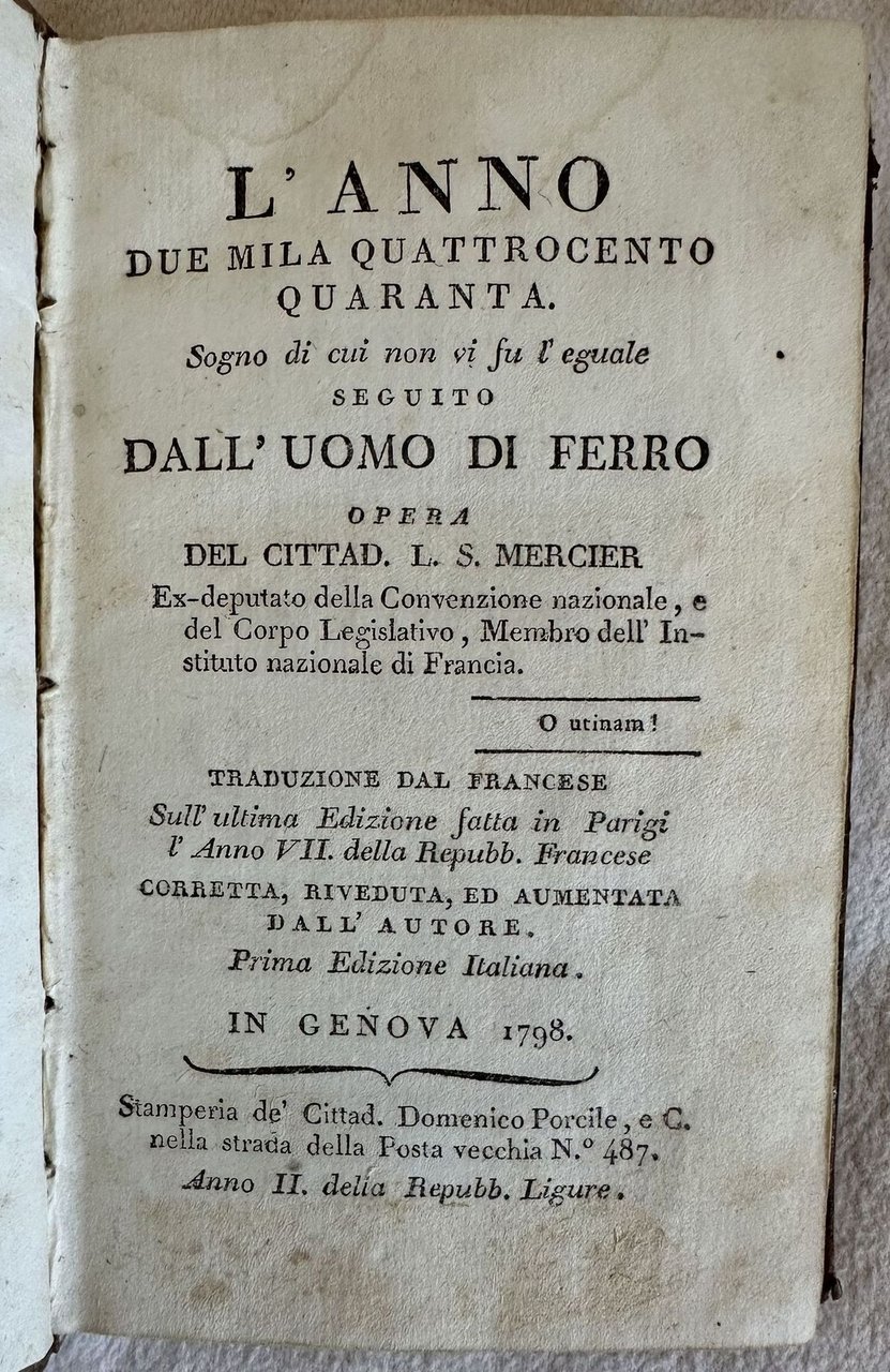 Rara prima edizione italiana del 1798 del celebre romanzo utopistico dell'intellettuale illuminista francese Louis Sebastien Mercier (1740-1814). L'opera pubblicata per la prima volta in Francia nel 1770 è antesignana della moderna letteratura fantascientifica. Il protagonista dopo un'accesa discussione con un amico filosofo in merito alla giustizia di Parigi cade in un sonno profondo e si risveglia in una Parigi del 2440. La città completamente rinnovata è ispirata agli ideali di libertà e di progresso umano e sociale dell'illuminismo. L'opera è composta da quattro volumi ed è completa. Alla fine del quarto tomo "Opinione di L. S. Mercier rappresentante del popolo sopra le sepolture private". Tagli marmorizzati. In buone condizioni. Copertina in piena pelle coeva con titolo e decorazioni in oro al dorso e piatti in buone condizioni generali con lievi usure ai margini e dorso. Legatura in buone condizioni. All'interno le pagine si presentano in buone condizioni con rare fioriture. Strappo orizzontale nelle pagine dalla 305 alla 312 con perdita di testo all'ultima carta che risulta tagliata a metà. Tomo primo: Frontespizio e pagina di indice ritagliati e applicati su un foglio di carta. Tomo secondo e terzo: margine inferiore del frontespizio restaurato. In 16. 15,5x9,5 cm. Pp. 313, 264, 234, 207+(1). Scarce first italian edition of 1798 of the famous utopistic novel by the french illuministic scholar Louis Sebastien Mercier (1740-1814). The work published for the first time in France in 1770 is pioneer of modern phantascientiphic literature. the main carachter after an argue with a phylosopher awakes in a Paris of 2440. the city is completely renewed and inspires to ideals of freedom and human progress typical of illuminis The work is made up of four tomes and it is complete. At the end of the fourth tome "Opinione di L. S. Mercier rappresentante del popolo sopra le sepolture private" about private burings Marbles edges. In good conditions. Full leather coeval cover with gilted title and decorations in the spine and plates in good conditions lightly worn in the extremities. Binding in good conditions. Pages are in good conditions with occasional foxing. horizontal tear in pages from 305 to 312 with loss of textint he last page that is cut into two parts. First tome: title page and pages of index cut and applied on a page of paper. Second and third tome: foot edge of title page is restored. In 16. 15,5x9,5 cm. Pp. 313, 264, 234, 207+(1).<BR><BR>