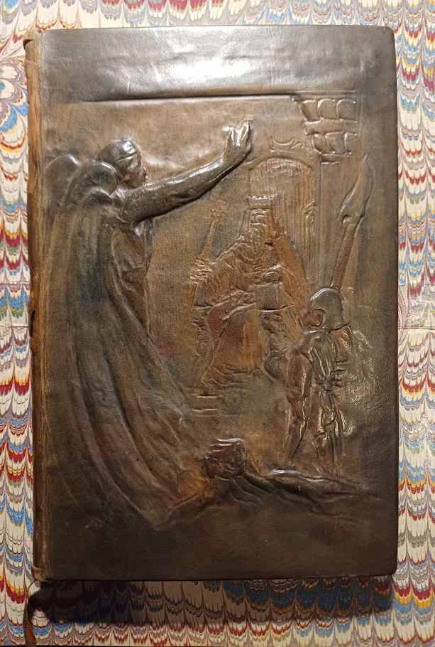 19 cm, magnifica rilegatura scultorea in pelle a firma Louis Dézé con figure e fregi in rilievo, ispirate al testo, ai piatti ed al dorso con titolo in oro, carte di guardia marmorizzate con bordatura a secco e nastro in seta, taglio superiore dorato, p. (4), 45. Esemplare numerato a mano dall'editore, numero 43 su 110, della tiratura di testa (sur Japon ou velin d'Arches), pubblicazione complessiva di 350 esemplari. Con un acquerello originale firmato da Édouard Fournier al recto della justification du tirage e 10 illustrazioni in nero nel testo disegnate da Fournier ed incise da Xavier Lesueur. Ogni tavola è ripetuta due volte su carte differenti e protette da velina. Al primo risguardo bell'ex libris della collezione di Margherita ed Enrico Paolo Vanelli, inciso e firmato da Alberto Martini. Al primo piatto bella scena ispirata dal testo con una figura alata rivolta verso un re su un trono accompagnato da una guardia armata, al piatto, sempre in rilevo una spada o pugnale ed una cornice geometrica per il titolo. Alla quarta copertina le iniziali di Dézé (L.D.) all'interno di una figura triangolare con al centro un mezzo busto di uomo incappucciato. Opera fantastica ambientata nell'antica città di Jebus, il racconto fa da epilogo alla celebre raccolta dei "Contes cruels". Bellissimo esemplare, reso unico dalle importanti personalizzazioni artistiche, in ottimo stato di conservazione.