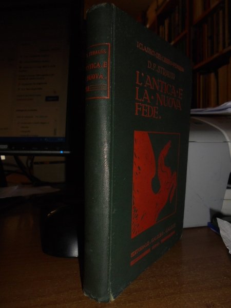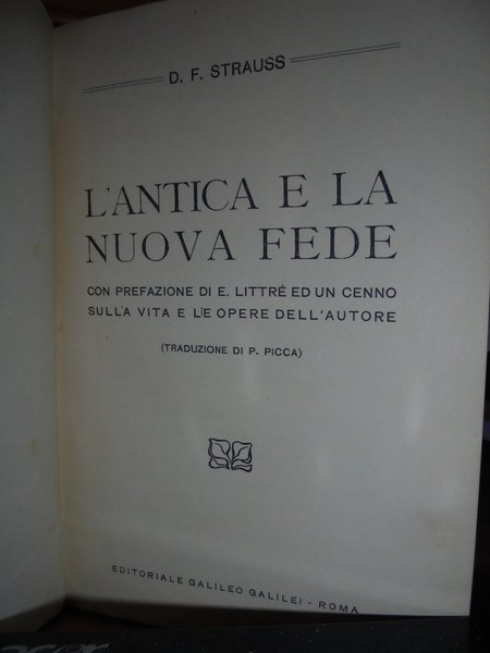 D.F. Strauss. Roma, Editoriale Galileo Galilei, s.d. (1914). L' Antica e la Nuova Fede. Con prefazione di E. Littré ed un cenno sulla vita e le opere dell' autore. Traduzione di P. Picca. In-16° grande, tela edit. con fregi e titoli rossi. 268, (1) pp. Ben conservato. Neg. mob. nero p.p. entro busta trasp.