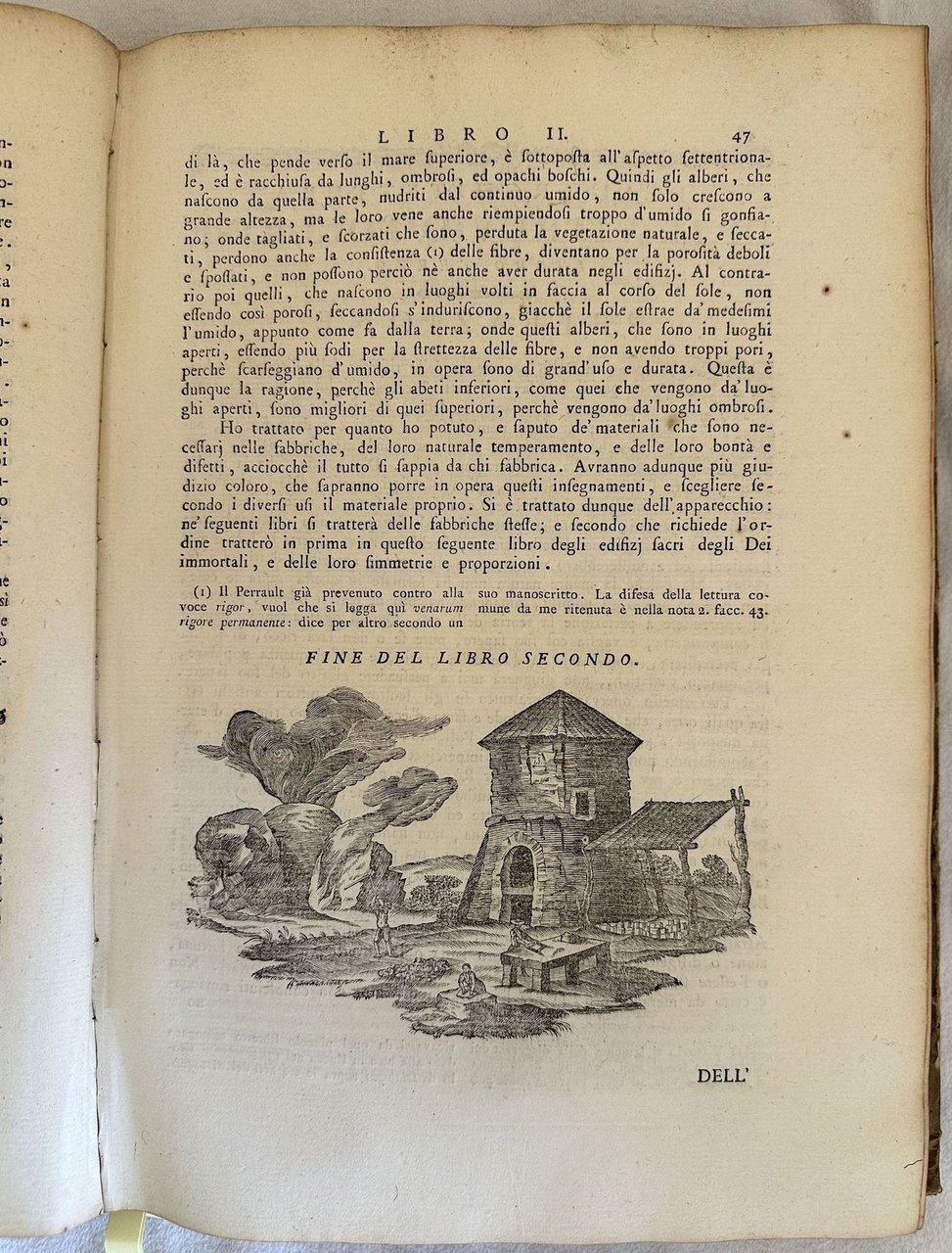 Seconda edizione illustrata del 1790 della traduzione del "De Architectura" di Vitruvio del marchese Berardo Galiani, e del relativo importante commento, fedelmente riproducente anche nei rami la prima, risalente al 1758. Cicognara, 735. Gamba, 2500 Finissima incisione in antiporta di F. La Marra su soggetto di Galiani. Alcune incisioni nel testo. Alla fine sono presenti venticinque tavole ripiegate: Piante di città e dei muri, Sfera dei venti e direzione di strade, Principi delle fabbriche e di divrse maniere, Proporzione del corpo umano, Ordini architettonici, Foro, Teatro romano e greco, Palestra, Casa romana, casa greca, Cortili, Acquedotti, macchine ec. "Stimatissima e ricercatissima versione, sin a tanto che altri eruditi s'accinsero a nuovi studii su Vitruvio e a nuovi volgarizzamenti". Tagli marmorizzati In ottime condizioni. Copertina in mezza pergamena coeva con titolo manoscritto al dorso in buone condizioni generali con lievi usure ai margini e dorso. Legatura in buone condizioni . All'interno le pagine si presentano in ottime condizioni con rare fioriture. In folio. Dim. 38x26,5 cm. Pp. (4)+XX+272+XXV tavole.Second illustrated edition of 1790 of the translation by "De Architectura" of Vitruvio by Berardo Galiani, and relating important comment, faithfully reproducing the first one of 1758. Cicognara, 735. Gamba, 2500 Very fine engraving in the frontspice by F. La Marra after Galiani. Some engravings in the text. At the end there are 25 out of text folded plates: Piante di città e dei muri, Sfera dei venti e direzione di strade, Principi delle fabbriche e di divrse maniere, Proporzione del corpo umano, Ordini architettonici, Foro, Teatro romano e greco, Palestra, Casa romana, casa greca, Cortili, Acquedotti, macchine ec. "Stimatissima e ricercatissima versione, sin a tanto che altri eruditi s'accinsero a nuovi studii su Vitruvio e a nuovi volgarizzamenti". Marbled external edges of pages In very good conditions. Half parchment coeval cover with handwritten title in the spine in good general conditions lightly worn i the extremities. Binding in good conditions. Inside pages are in very good conditions with occasional foxing. In folio. Dim. 38x26,5 cm. Pp. (4)+XX+272+XXV tavole.