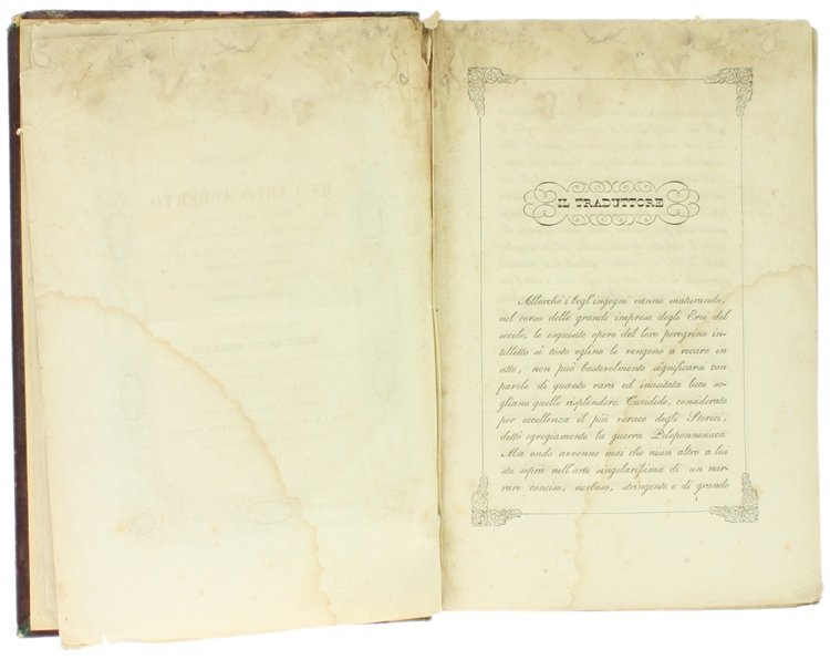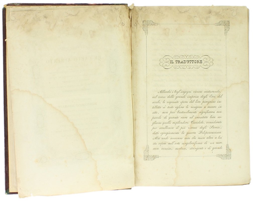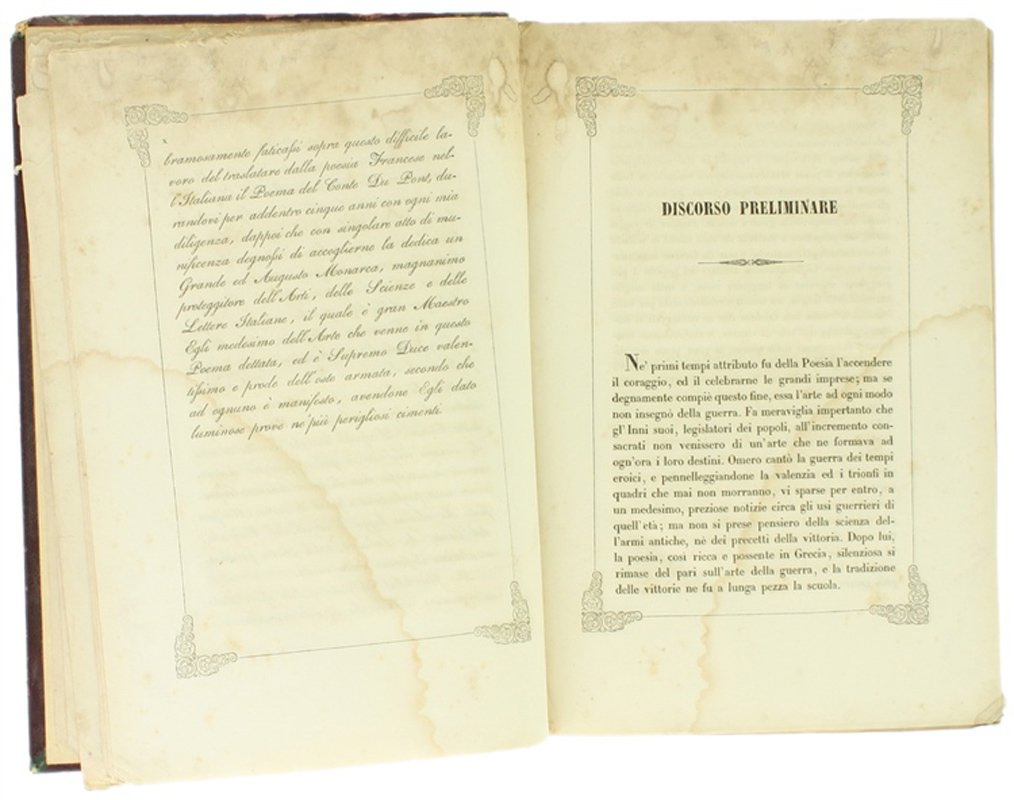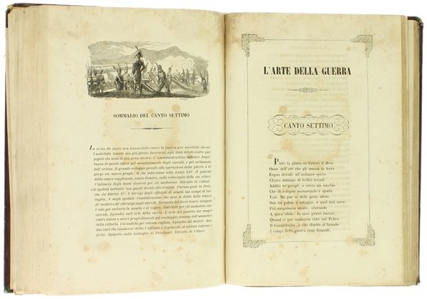 (Codice AN/2611) In 8° (6)-XLIV-642 pp. Edizione prima ed unica, assai rara. Poema in versi composto dal Bellini, docente di lettere classiche e scrittore nativo di Griante (Como), autore di opere teatrali, un Lexicon graeco-latinum e collaboratore del Dizionario delTommaseo. Il Bellini attribuisce il poema a un immaginario Conte Du Pont, ufficiale francese esperto di cose militari. Occhietto (con scarabocchi a matita), frontespizio e dedica con ricche ornamentazioni tipografiche. Testo incorniciato ad ogni pagina, con 10 graziose incisioni, ognuna all'inizio di ogni canto: vignette incise da Ratti su bozzetti di Focosi. Carta danneggiata per antica umidità: lievi aloni, fioriture al margine superiore con indebolimento della carta. Buona legatura, mezza pelle coeva, con nervi, tassello mancante. Volume che ha sofferto le ingiurie del tempo, ma testo valido e completo di opera introvabile. ~~~ SPEDIZIONE IN ITALIA SEMPRE TRACCIATA