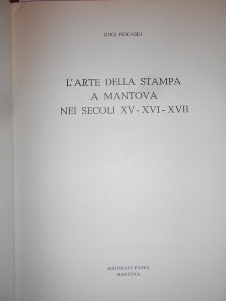 PESCASIO LUIGI. Mantova, Editoriale Padus, 1971. L' ARTE DELLA STAMPA A MANTOVA NEI SECOLI XV-XVI-XVII. In-4°, tela edit. con titoli in oro e impressione sul piano anteriore. 321 pp. con numerosi fac-simili n.t. stampato su carta pesante vergellata. Esemplare come nuovo n° 123. Uff. B - III - 5