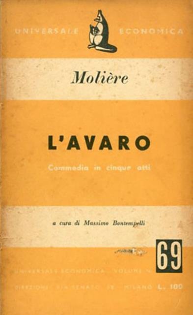 114 p. ; 18 x 11 cm. Universale economica, 69. Letteratura, 31. Questa commedia, concepita nel 1668, è indubbiamente fra le più famose di Molière. «L’Avaro, in cui il vizio distrugge ogni pietà che unisce il padre al figlio, è di una straordinaria grandezza e raggiunge un alto livello di tragicità»: anche Goethe al pari di tanti altri critici leggeva, dietro l’apparente comicità di Arpagone, il più ossessionato e ossessionante dei grandi protagonisti del teatro molieriano, il dramma di un uomo, prima vittima di se stesso e delle proprie angherie contro gli altri. Soppresso ogni sentimento umano tranne l’avarizia, odiato perfino dai propri figli, questo personaggio, ispirato all’Aulularia di Plauto, continua a essere uno dei più celebri e amati del commediografo francese. Titolo originale dell'opera: "L'Avare". A cura di Massimo Bontempelli. Brossura editoriale, coperta in cartoncino flessibile colorato (b/n e giallo), titolo impresso al piatto e al dorso. Leggero ingiallimento della carta, qualche segno del tempo ai profili della coperta, per il resto esemplare integro. Codice libreria 6965.