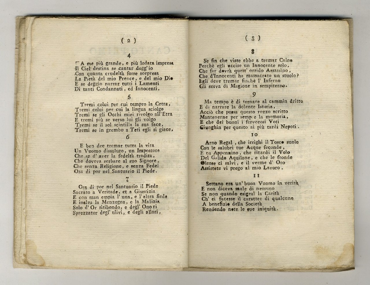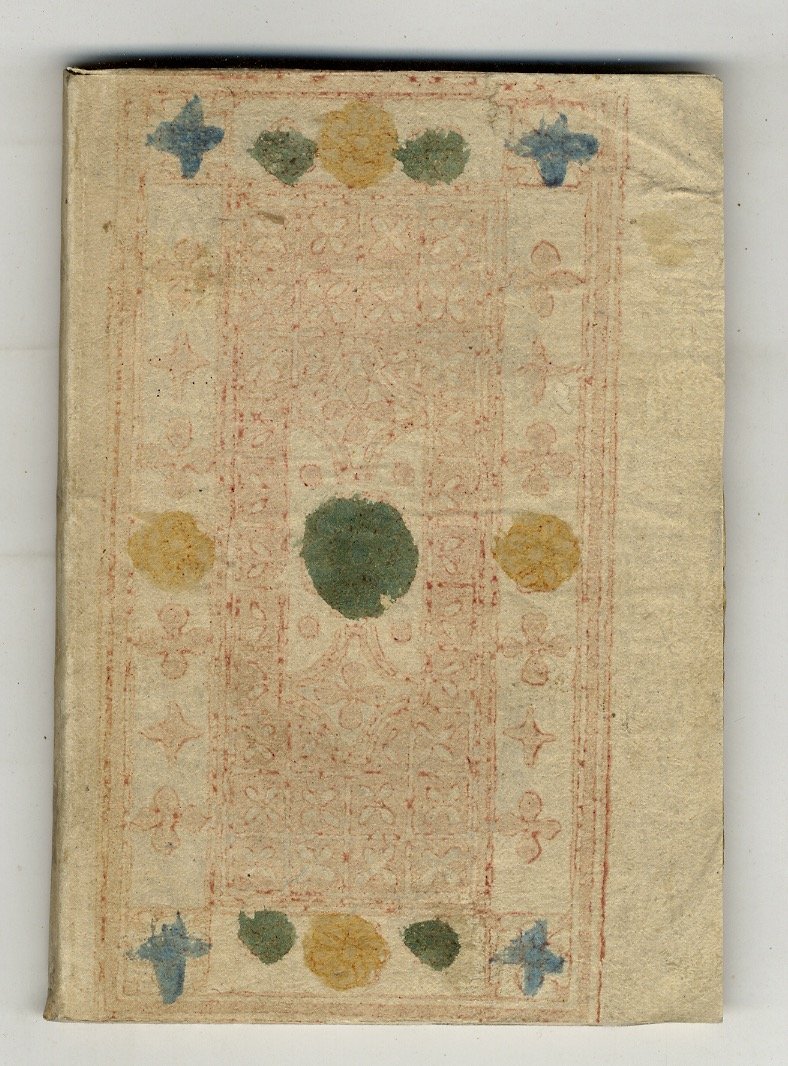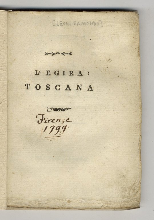 In Crema [ma Firenze], per Luigi Presidenti S. del B.G., [1801], in-8 piccolo, legatura in cartoncino decorato coevo, pp. XIV, [2], 80. L'Autore si firma Clemente Pesci a c. π3v, ma Per il nome reale, Leoni Raimondo, cfr. CLIO, vol. 4, p. 2598. Nota manoscritta coeva sull'occhietto: Firenze 1799. Poesia satirica politica in cinque canti nel contesto dell'invasione delle truppe napoleoniche in Toscana marzo 1799 e la loro espulsione a breve termine da parte degli austriaci. Ottimo esemplare.