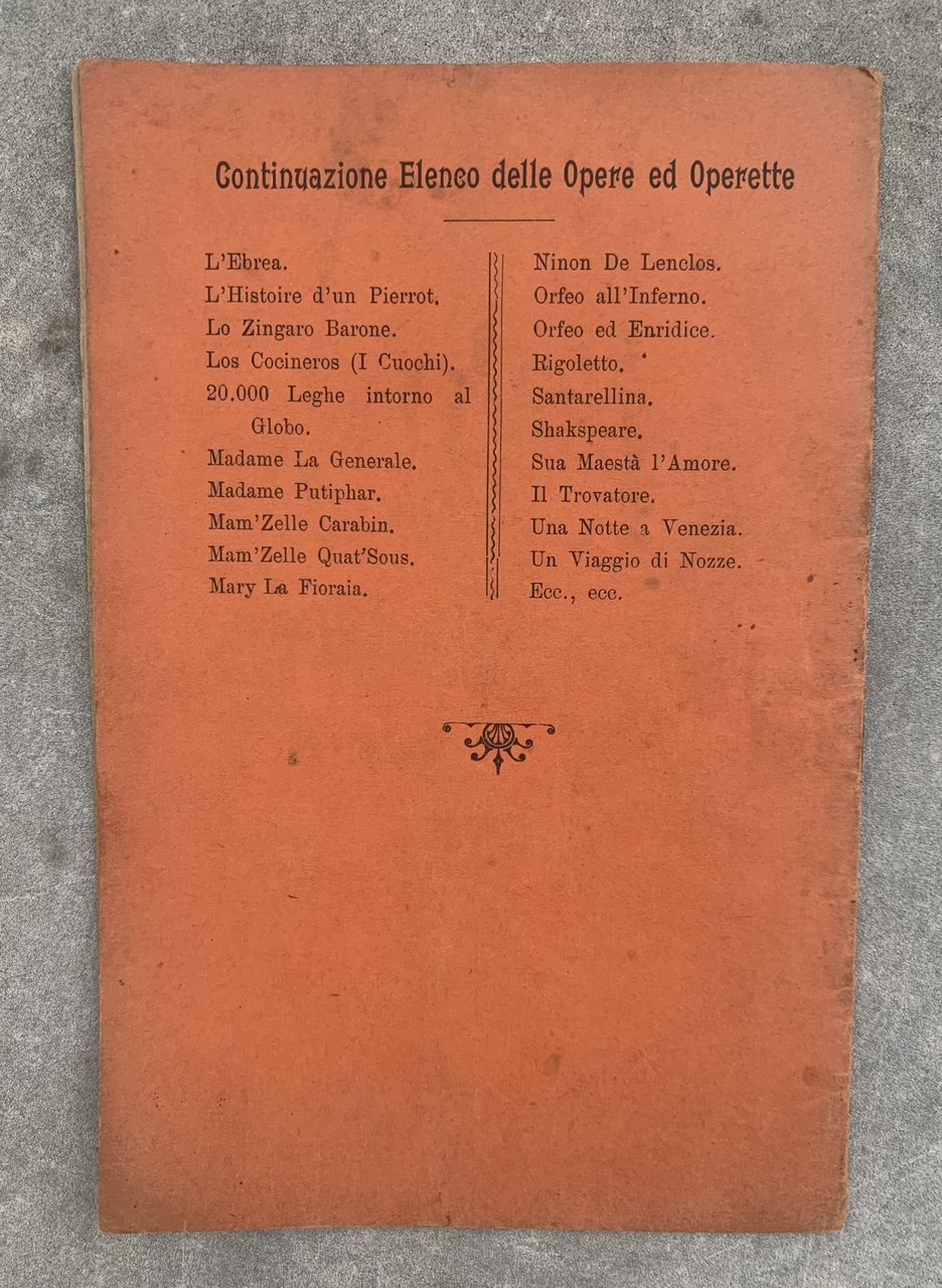 ed. s.d.. XVI/32/brossura in cartoncino albicocca con titoli ornati in nero ai piatti. Stato buono (leggera usura della copertina ai margini - qualche piegatura in copertina - copertina e pagine brunite e con piccole fioriture - cartiglio incollato in calce al primo piatto della copertina con il nome del Deposito dei libretti d'Opera e Operetta Casa Pavesi Cesare di Milano: Edicola Giofrnali Ernesto Bruni, Via Cernaia presso il giardino La Marmora).