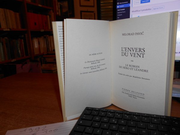 Milorad Pavić. Paris, Belfond, 1992. L' Envers du Vent. Le roman de Héro et Léandre. Traduit du serbe par Madeleine Stevanov. In-8°, tela edit. bleu con titolo in oro al dorso, sovracopertina ill. a coil. 111, (1) pp.; 127, (1) pp. Ottimo stato di conservazione. Uff. stanzetta mob. sinistra III - 4 carc.