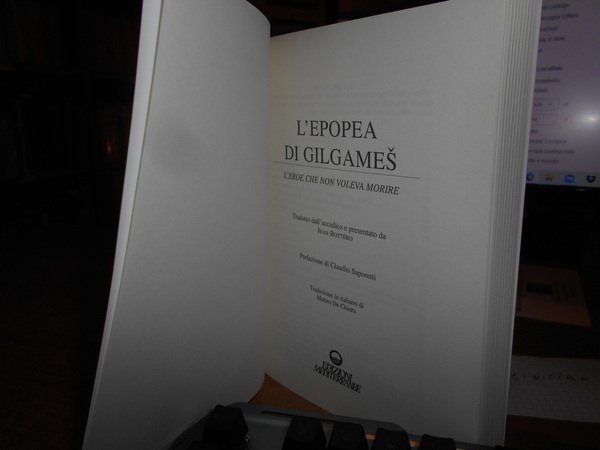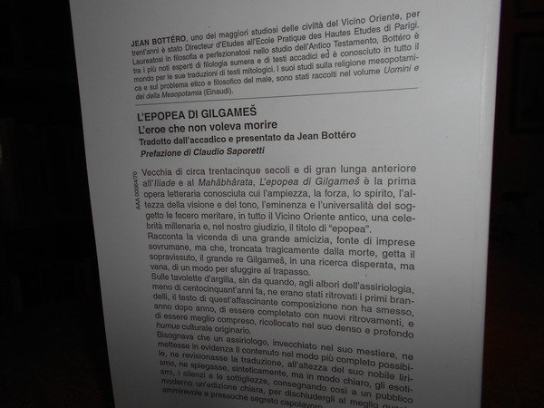 Tradotto dall' accadico e presentato da Jean Bottéro. L'EPOPEA DI GILGAMES. L'EROE CHE NON VOLEVA MORIRE. Prefazione di Claudio Saporetti. Traduzione in italiano da Matteo De Chiara. In-8°, br. ill. a col. 296 pp. Come nuovo. Stanzetta mob. a sinistra