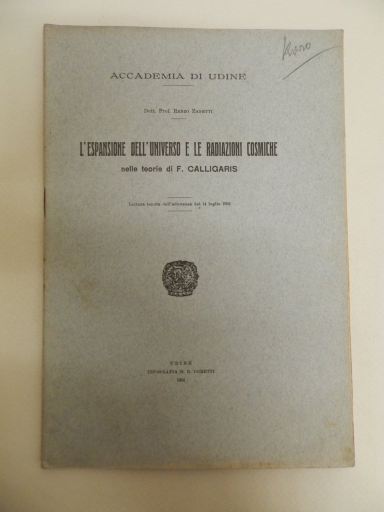 8^, pp. 21, una tavola fuori testo, brossura editoriale, titolo al piatto, Lezione tenuta nell'adunanza del 14 luglio 1932. Nel presente opuscolo viene spiegato come si possa dimostrare l'espansione dell'universo attraverso le radiazioni cosmiche. Esemplare molto buono. *** TUTTI I NOSTRI LIBRI SONO VISIBILI PREVIO CONTATTO MAIL O TELEFONO NELLA NUOVA SEDE DI MILANO: LIBRERIA COSMOPOLIS, VIA JOMMELLI, 22. ***