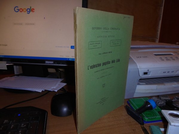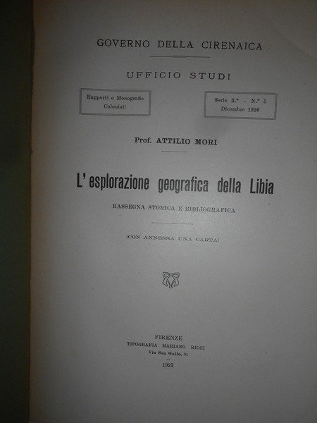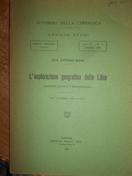 Prof. Attilio, Mori. Firenze, Tipografia Mariano Ricci, 1927. L' Esplorazione geografica della Libia. In-8°, br. orig. 112 pp. (con annessa una carta più volte ripiegata). Esemplare ben conservato. Uff. A - I - 1 - 2
